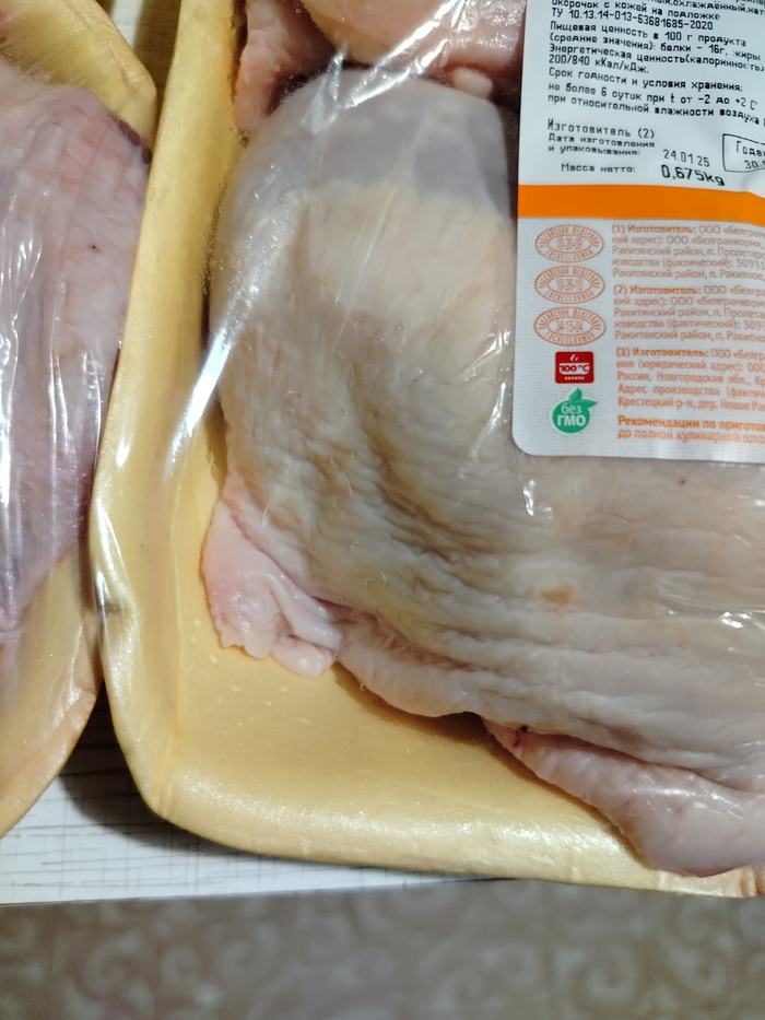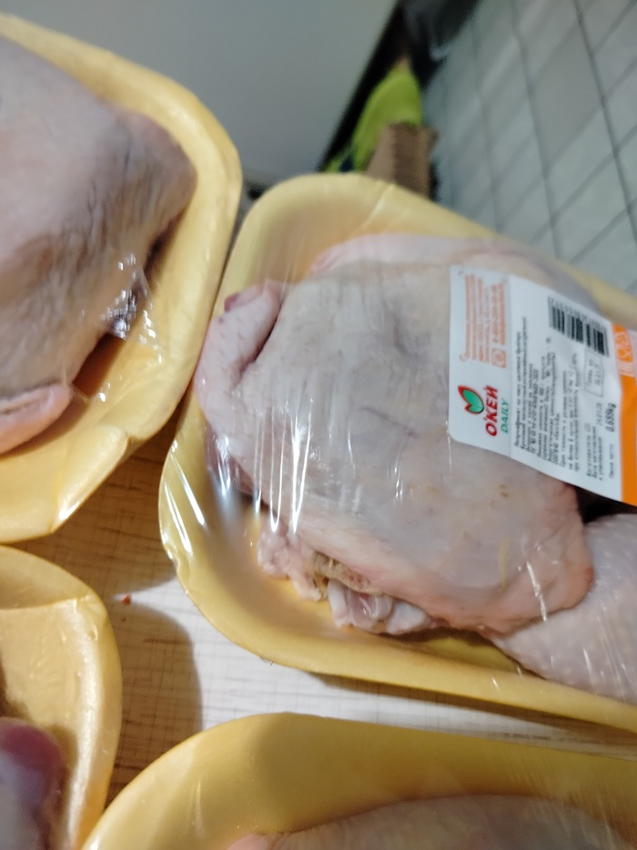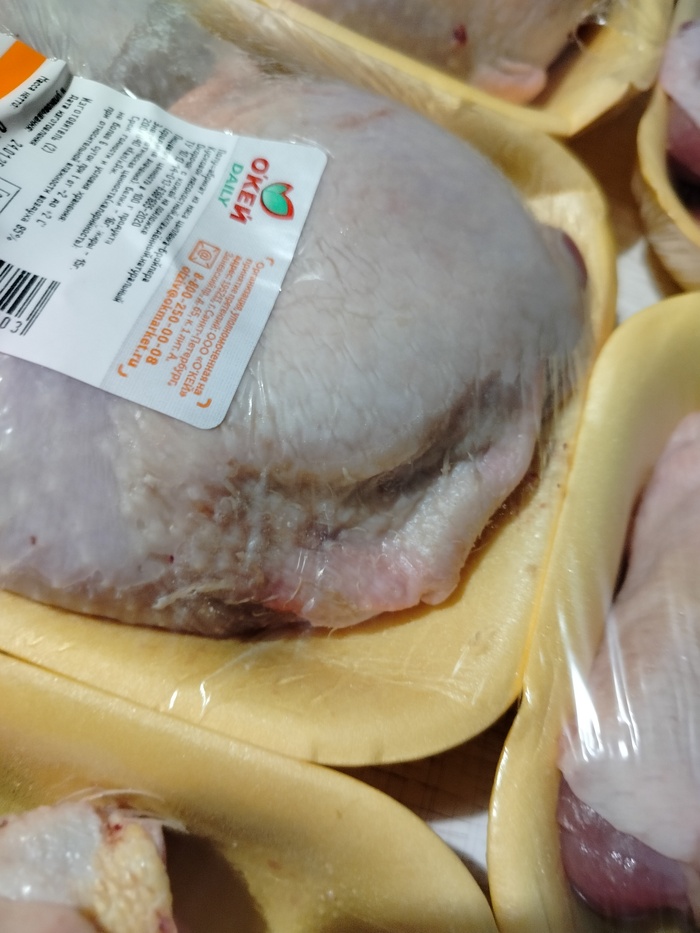 27.01.25 Заказала через приложение Купер продукты в магазине Окей. в заказе присутствовала позиция 15 упаковок окорочков куриных. Заказ привезли 27.01.25 в 22.00. Курица оказалась ни просто не свежая она откровенно реанимированная, от неё пахнет хлоркой и подгнившим мясом 🤢. Видео и фото подробное есть. Сроки на наклейка от магазина Окей стояли такие: упаковано 24.01.25 годен до 30.01.25, НО товар явно переупакован, свежая плёнка и этикетка на порченой, подгнившей продукции просто не может быть. И из десятка яиц было разбито одно яйцо. В карточке товара был указан вес десятка яиц- 500гр., НО яйца настолько мелкие (с грецкий орех размер), что в них врят-ли будет 500гр.