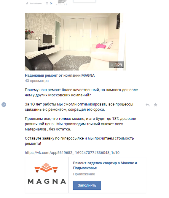 Сие событие, невероятно потрясшее моё спокойное похмельное утро, произошло не далее, чем с час назад. С мной связалась некая Ирина Перова(https://vk.com/id290376364) и сообщила, что нашла меня в какой-то там группе по ремонту, а это очень интересно, ведь я ни в каких таких сообществах не состою и не состоял, ну да ладно. Может, я переместился в параллельную вселенную, где я состою в подобной группе, кто знает? Да и страница чуть ли стопроцентный фейк, но идём дальше. Едва поздоровавшись, начала закидывать меня рекламой ремонтной компании Магна(http://msk-magna.ru/).