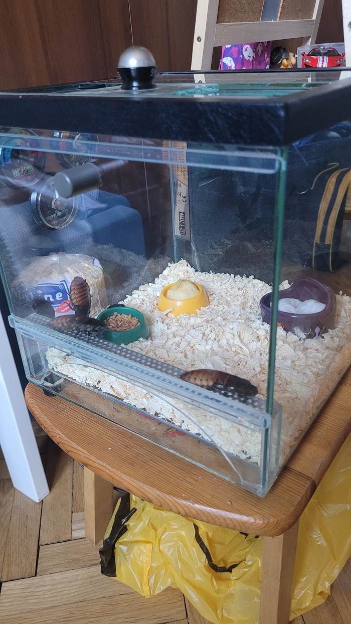 Я решил заморозить квартиру. На улице было +5-7, открыл все окна, закрыл батареи отопления и пошёл гулять с собакой и заодно отнести взрослых тараканов в зоомагазин. В магазине их приняли без проблем.