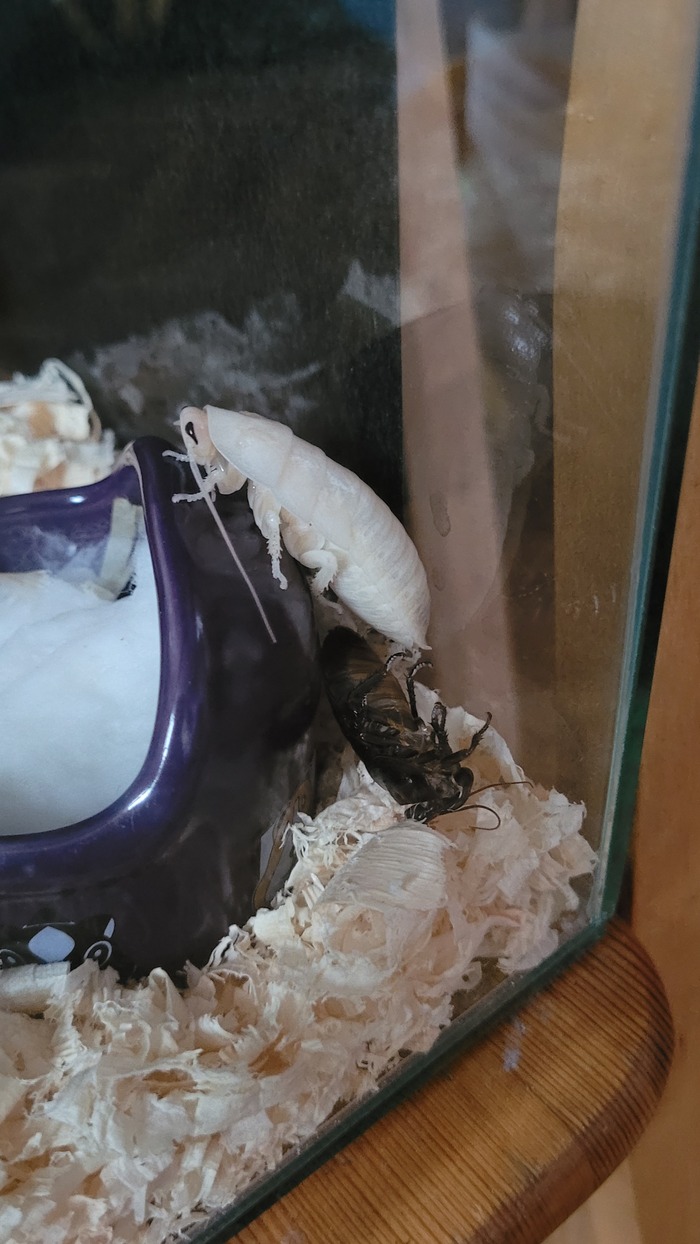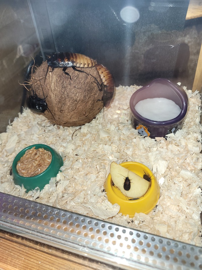 Погуглил как ухаживать. Поставил крышечку с водой, кормил банановой кожурой и кусочками яблок. И держал аквариум в ванной. Там темно, тепло и влажно. Аквариум сверху был накрыт пищевой плёнкой с дырочками. И влажность поддерживать, и тараканы не вылезут, и воздух есть.