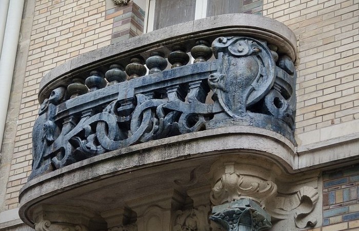 Стоит отметить ассиметрию здания — это характерная черта французского арнуво. Благодаря отсутствию симметрии строение приобретает изящество и тягучесть форм, неповторимость и меланхолию. Венчает здание великолепная отделка мансарды. Яркий и отчетливый карниз с массивным убранством оконных порталов, керамическими колоннами и переплетением ограждения балконов перетекает в стилизованные замковые камни, которые смотрятся как плюмажи на гусарских головных уборах, а угловые элементы — как эполеты.