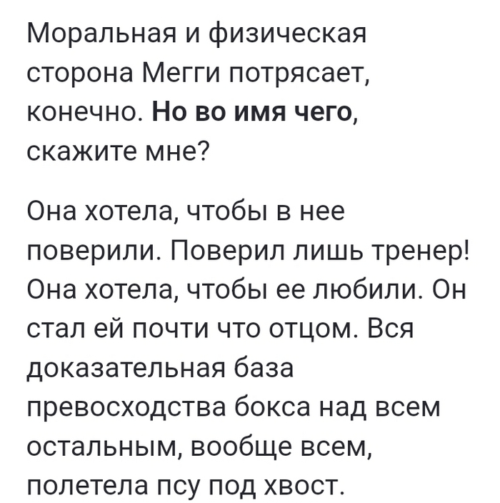 Так она всеми силами пыталась вырваться из нищеты и от отчаяния пошла в бокс, хоть это и травмоопасно. Саму суть автор не уловил, посмотрите момент, как она собирает остатки еды со стола, не доеденные посетителями в кафе и врет, что берет их собаке, а сама сидит полуголодная, считает каждый цент в банке с чаевыми. Поколению слащавых изнеженных манкюрами, доставкой еды, качающие жопы и сиськи вместо мозгов, ну как вы сможете что то понимать.