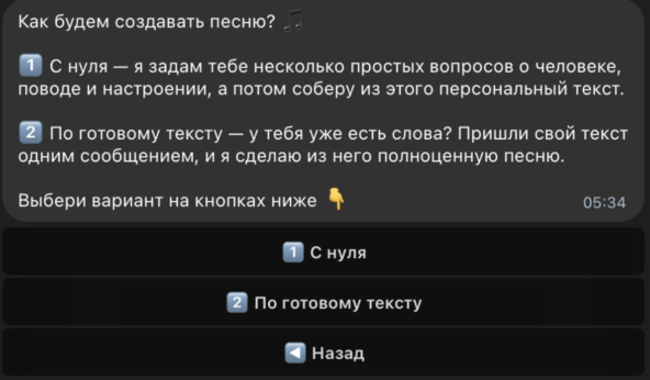 Боты и нейросети. Скорость — их главный плюс. За счёт автоматизации они создают трек за минуту-две, а не за час, как программы на ПК. Для праздников, поздравлений и “музыки по запросу” это самый удобный формат.