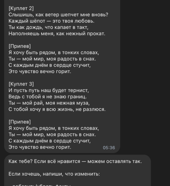 Бот сам соберёт мелодию, текст и вокал. Ничего редактировать не нужно — просто сохраняйте готовую песню.