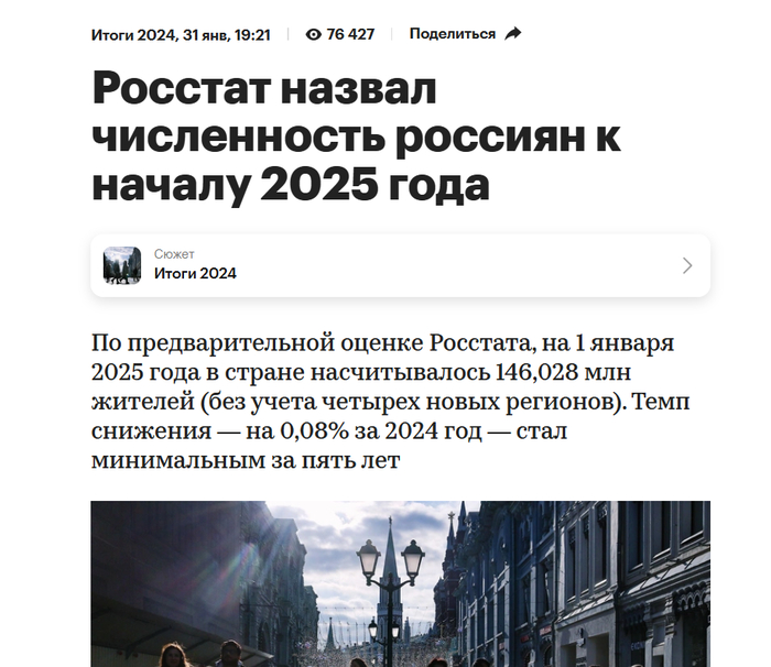 В процентном отношении темп сокращения численности россиян за 2024 год стал самым медленным за пять лет (в 2019 году было минус 0,02%). За 2023 год численность населения снизилась на 0,20%. В последний раз население России прирастало в 2017 году. При этом по состоянию на 1 ноября 2024 года Росстат отчитывался о сокращении численности населения с начала года на 0,11%, то есть за ноябрь—декабрь население должно было подрасти. (с)