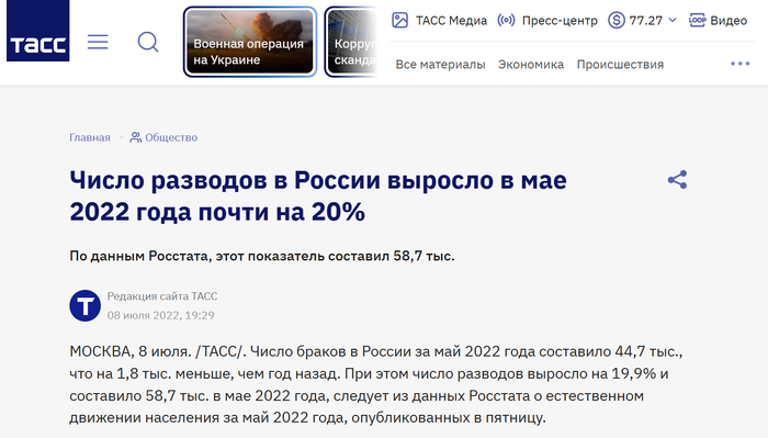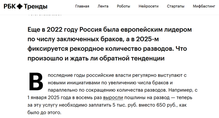 Почитание начальства в РФ, бывшей СССР, вбито в людей глубоко и действует почти безотказно Но даже оно имеет свои пределы, за которые лучше не переступать. Поэтому считается хорошим тоном не обращать внимания на неприглядные обстоятельства, но и на смягчённые данные РосСтата: не надо задумываться, начальству виднее. Российская цифирь - не для слабонервных. Всё как при Советской власти: на деле - одно, в публикуемых данных - совершенно другое. Реальные цифры в сегодняшней РФ, как касса у пьяной кассирши, постоянно нуждаются в коррекции. Реальные цифры российских разводов ужасающе велики, и гражданам РФ эти цифры лучше не знать. Или если знать, то не сразу. Коррекцией цифр, характеризующих ситуацию в стране, занимается РосСтат. У этой медали две стороны. С одной стороны, РосСтату у нас принято верить, как откровениям свыше. С другой стороны, РосСтат у нас в России бабский, как и всё остальное, поэтому РосСтату не впервой вешать людям лапшу на уши. Навешают и в этот раз, дурное дело нехитрое.