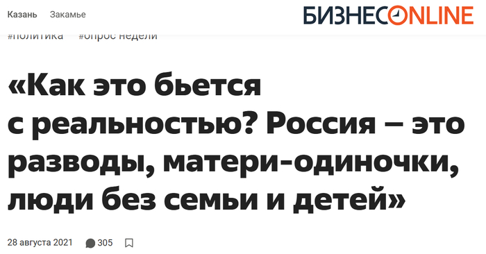 «Проблема в том, что такая установка слабо бьется с реалиями сегодняшней России. Сегодняшняя РФ, особенно городская, — это разводы, матери-одиночки, люди без семьи и детей.»