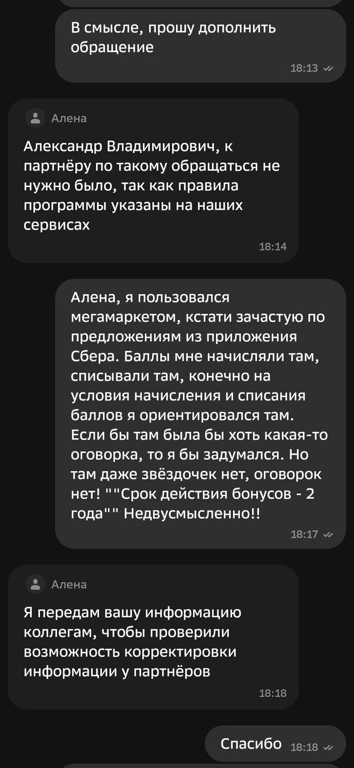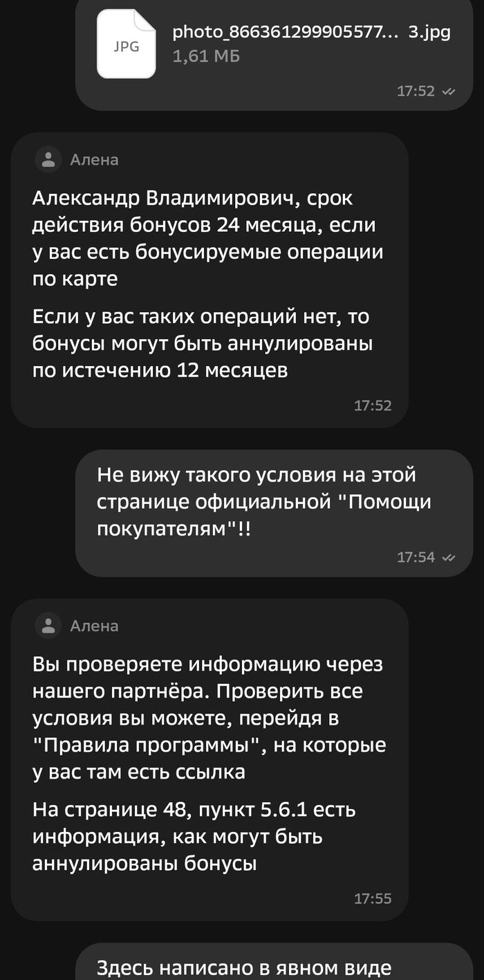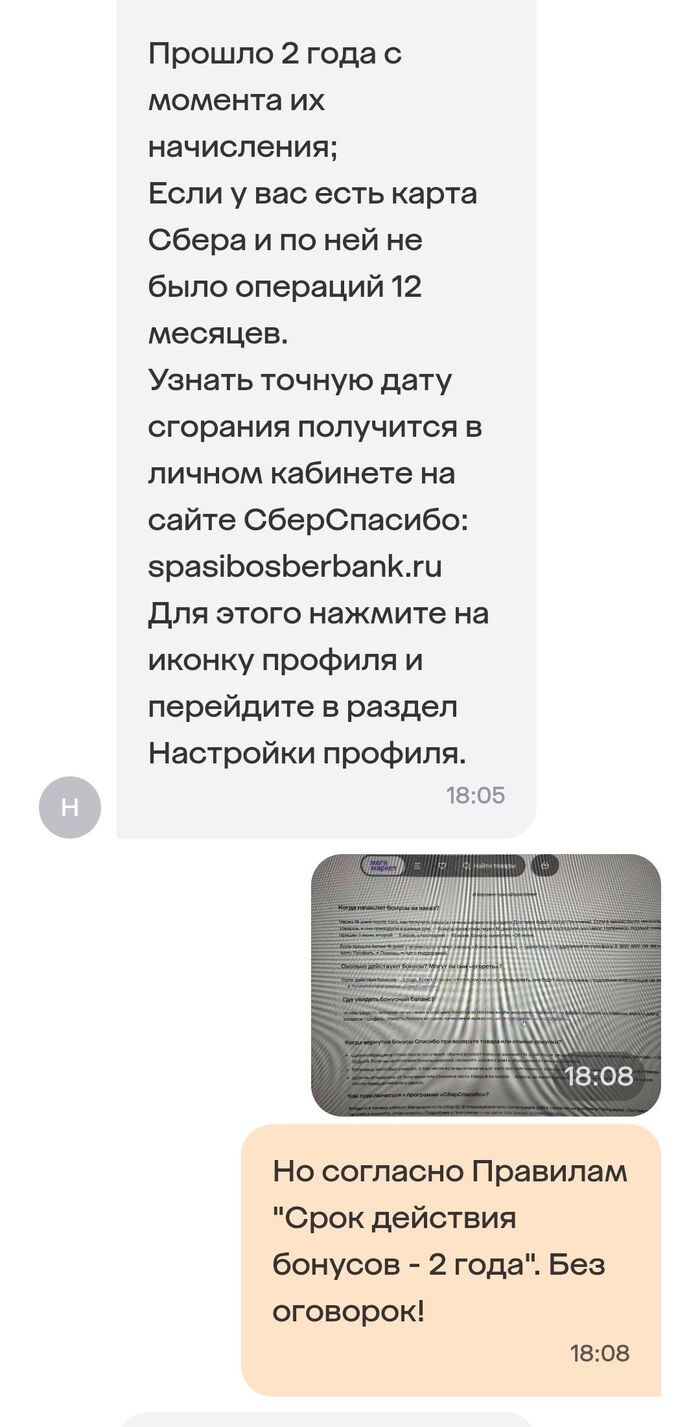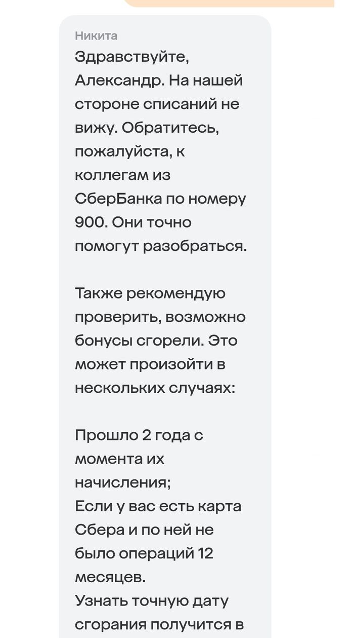 Поддержка Сбера говорит мне, что они не отвечают за информацию партнера и его действия, а правила сгорания бонусов у них гораздо более расширенные, и оказывается, есть даже причина, по которой бонусы могут сгореть через не через два года, а через 12 месяцев. Да, есть такая причина, и странно, что вы о ней не знаете, ведь об этом же прямо написано на стр. 48 Правил. Да, они так и отвечают в чате. Читайте Правила!! Третий абзац убористого текста на стр. 48, пункт 5.6.1, как же вы его не заметили?