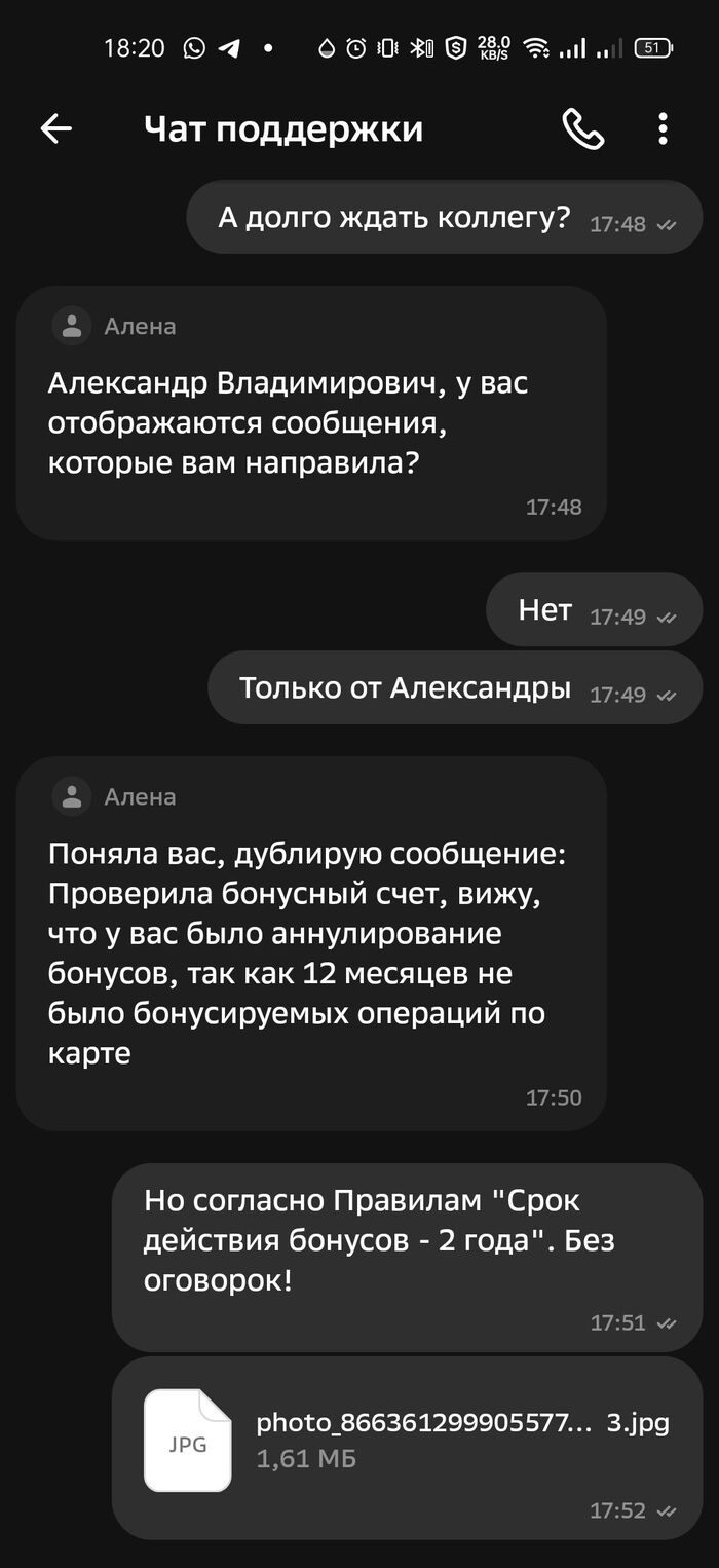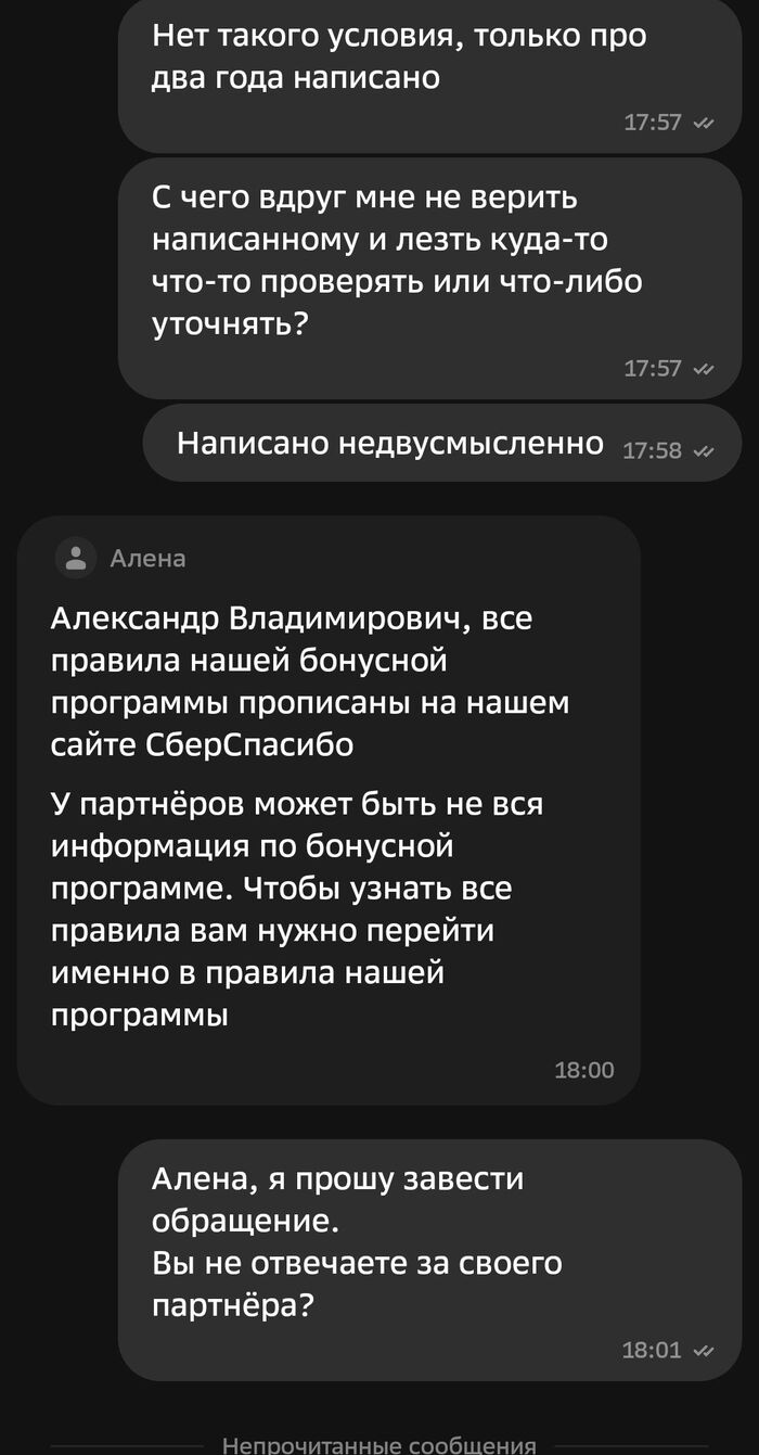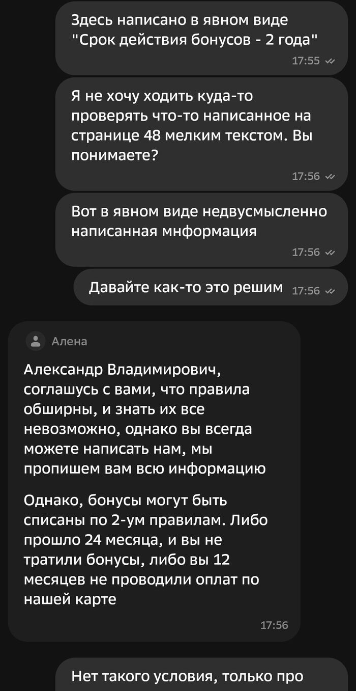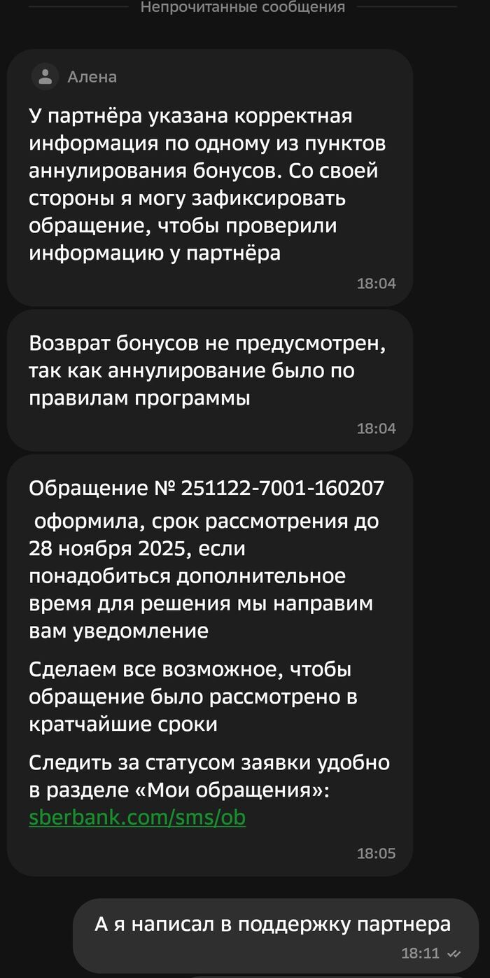 Поддержка Сбера говорит мне, что они не отвечают за информацию партнера и его действия, а правила сгорания бонусов у них гораздо более расширенные, и оказывается, есть даже причина, по которой бонусы могут сгореть через не через два года, а через 12 месяцев. Да, есть такая причина, и странно, что вы о ней не знаете, ведь об этом же прямо написано на стр. 48 Правил. Да, они так и отвечают в чате. Читайте Правила!! Третий абзац убористого текста на стр. 48, пункт 5.6.1, как же вы его не заметили?