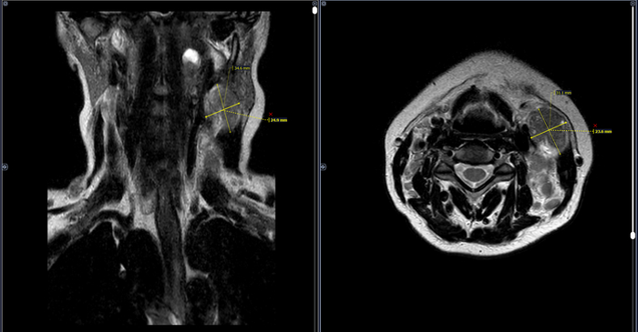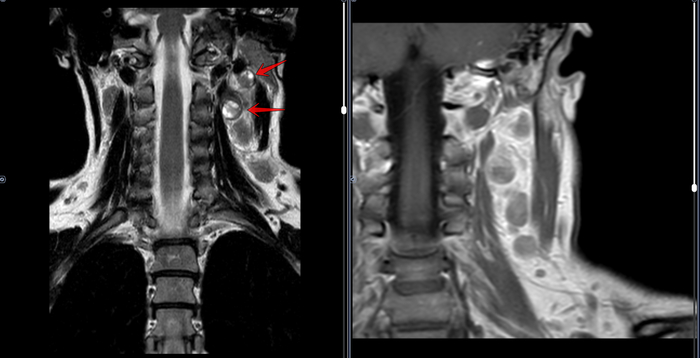 Таким образом, для рентгенолога при описании КТ/МРТ у пациента с меланомой ключевое внимание должно быть сосредоточено на оценке инвазии в критические структы: основание черепа, крыловидно-небную ямку, сосуды (особенно сонные артерии) и нервы. Выявление периневральной инвазии или прорастания кости — это не просто констатация факта, а прямая подсказка для хирурга об объеме необходимого вмешательства. Пациенту с подозрением на меланому или с установленным диагнозом следует обращаться к дерматологу и онкологу. Лечащему врачу на основании данных визуализации необходимо четко планировать совместно с хирургом и радиологом возможность и целесообразность радикальной резекции, используя интраоперационное патогистологическое исследование для контроля краев резекции.