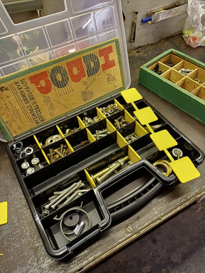 Намедни обнаружил схронилище крепежа, которое мой папанька скромно накопил в недрах гаража. Винтики и гаечки жили в ящике для гвоздиков и шурупчиков! Логично же.