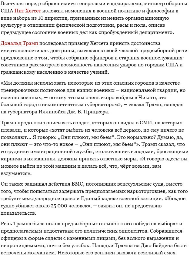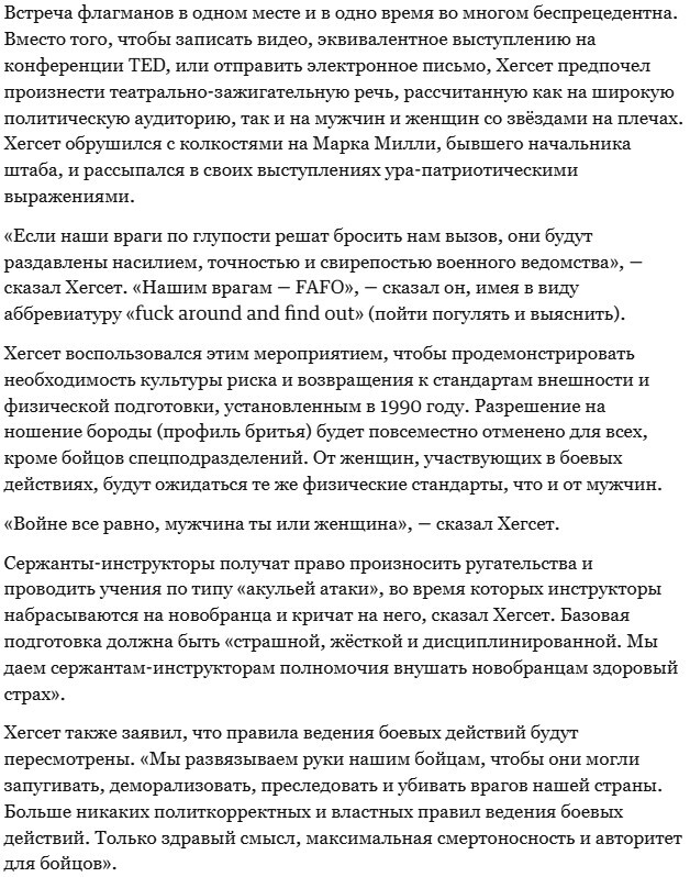 «Чтобы сохранить этот мир, мы (коллективный Запад/ — «Газета») должны быть готовы к вероятности войны как морально, так и в военном отношении. Необходимо изменение в менталитете: мы должны перейти в режим войны для решительного сдерживания, обороны и защиты мира»