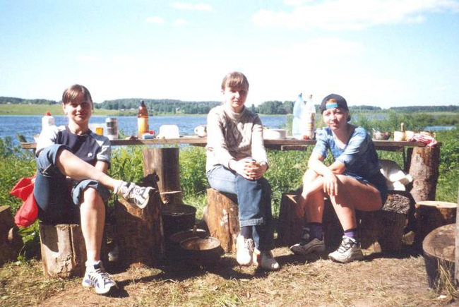 Еду готовили по двое, т.к. нас было довольно мало, дежурства выпадали часто. В обязанности дежурных входило встать раньше всех, развести костер, приготовить завтрак. Потом отмыть кастрюли, притащить дрова и приготовить обед: первое, второе и чай. Снова отмыть кастрюли, снова притащить дрова и приготовить ужин. Потом натаскать воды для следующей смены. Кроме того надо было всегда находится в лагере и быть в курсе, кто куда пошел. Звучит не так сложно, но на деле на это уходил почти весь день. Водой в озере мы не пользовались, ее приходилось таскать из кафе «Березка» с другой стороны леса. А еще ЯГ был против чистящих средств, поэтому котелки и кастрюли мы оттирали травой и ветками. Пустые жестяные банки обжигались на костре и закапывались в яму. Кстати, тогда еще не было этих открывающихся банок с «язычком», консервы вскрывались обычным ножом. Больше особых отходов не было. Все сыпучие продукты и макароны еще дома пересыпались в бутылки из-под воды, по мере опорожнения эти бутылки использовались снова под воду. Стеклянные банки были под запретом. Из страшного – в этот раз у нас не было стационарного туалета. Вернее он был, но в таком состоянии, что сходив туда однажды, никто не отваживался рискнуть второй раз. Поэтому ходили «девочки налево, мальчики направо» (с саперной лопаткой).
