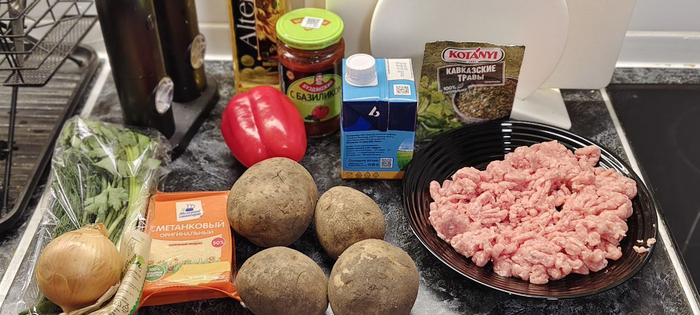 Картофель, фарш ( домашний), сыр, болгарский перец, масло, сливки, лук, зелень, томатный соус, приправы, соль и перец.