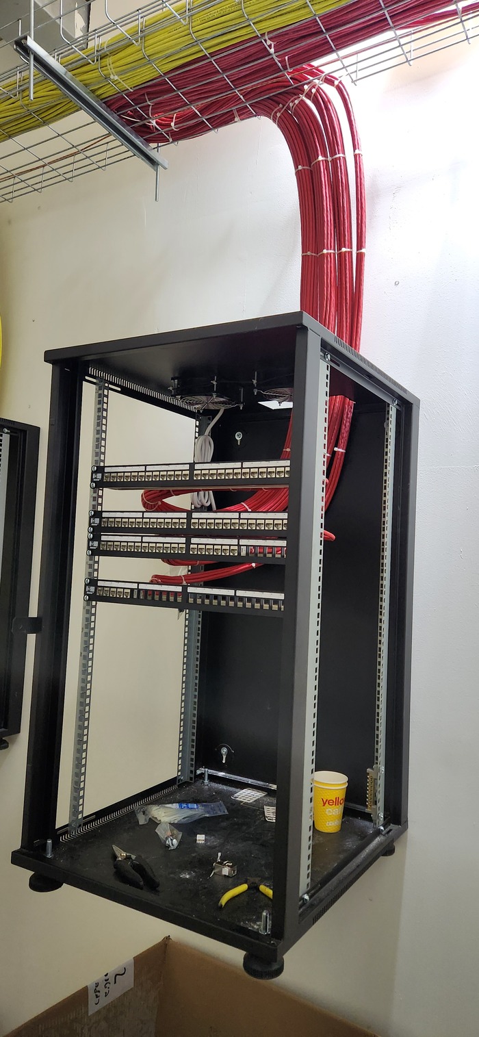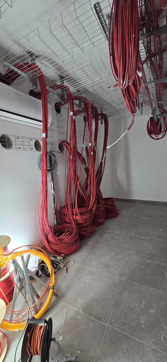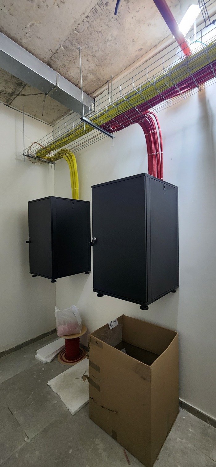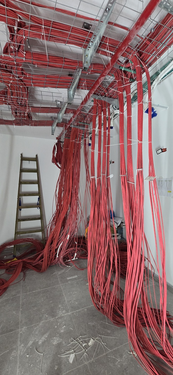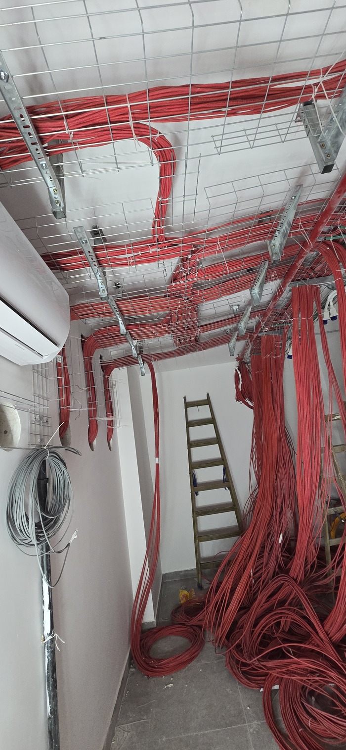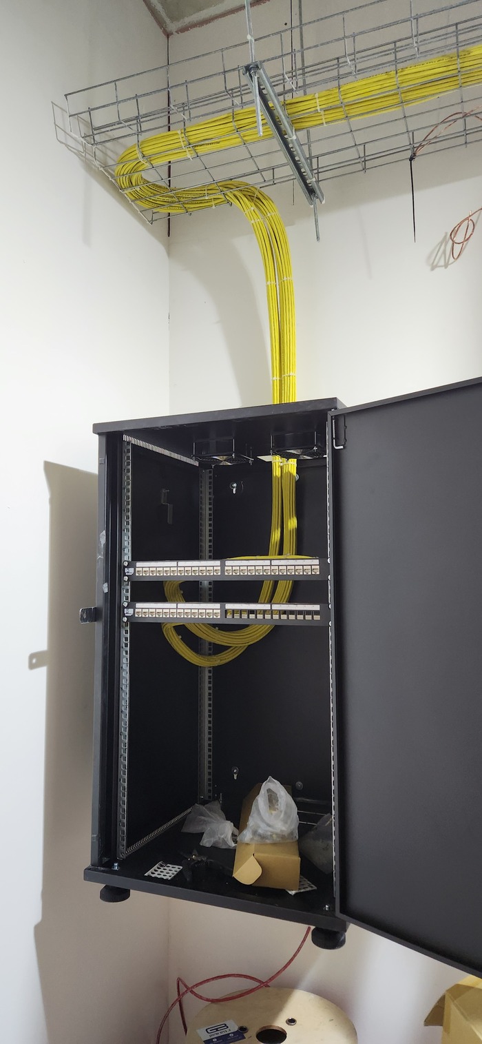 Здание на 7 этажей. Начали с первых четырёх не считая этаж нулевой. На каждом этаже точек по 150 и телефония и обычные точки. На данном этапе протянули 4 этажа. Шкафы закончили только на двух этажах. Жёлтый кабель кат 7а для телефонии. Красный всё остальное.