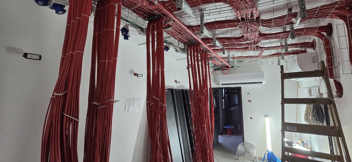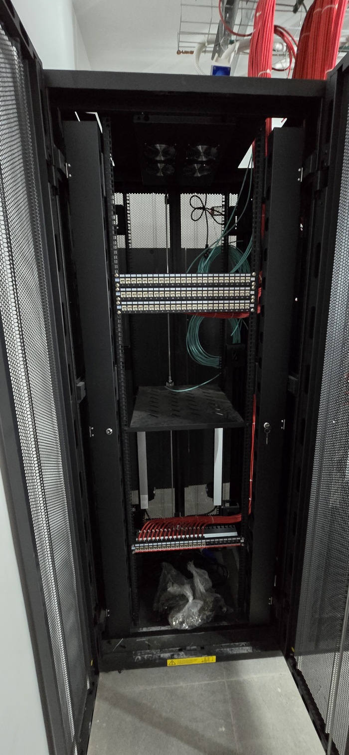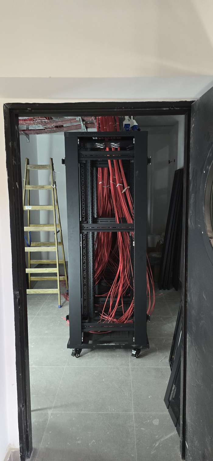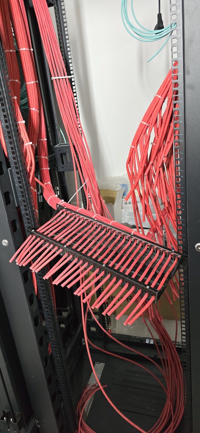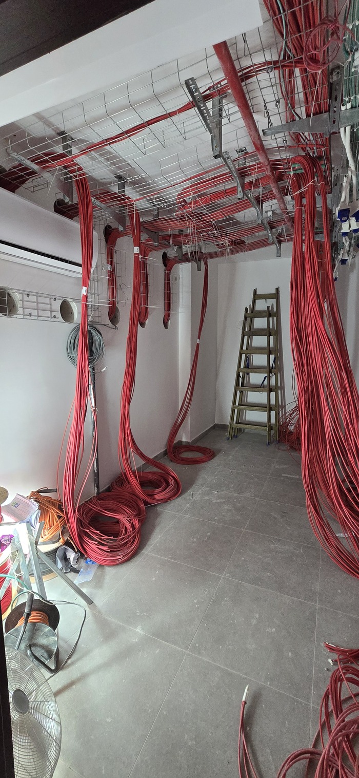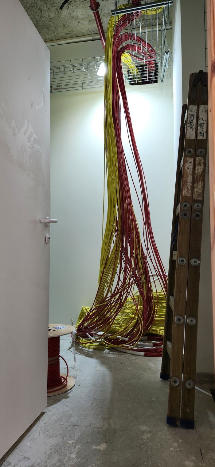 Здание на 7 этажей. Начали с первых четырёх не считая этаж нулевой. На каждом этаже точек по 150 и телефония и обычные точки. На данном этапе протянули 4 этажа. Шкафы закончили только на двух этажах. Жёлтый кабель кат 7а для телефонии. Красный всё остальное.