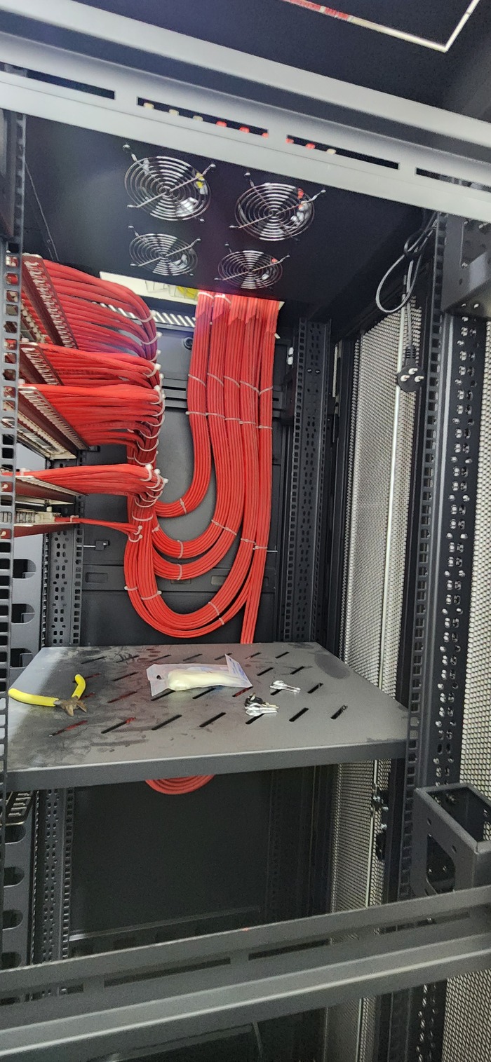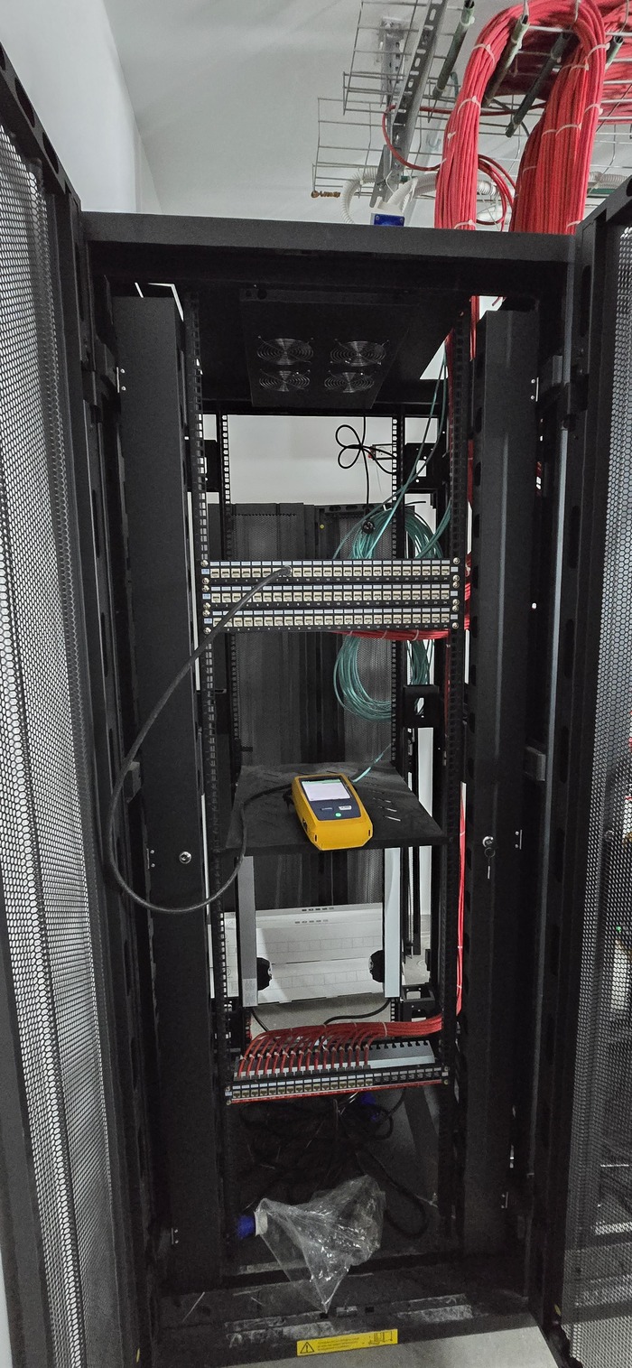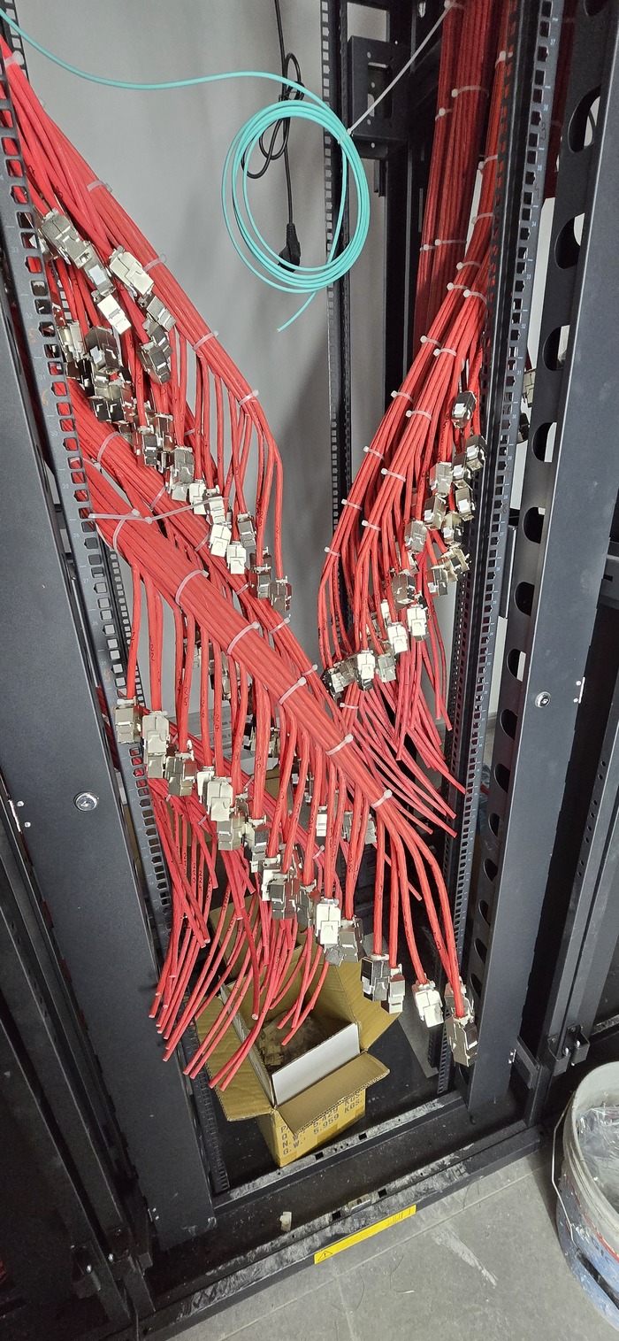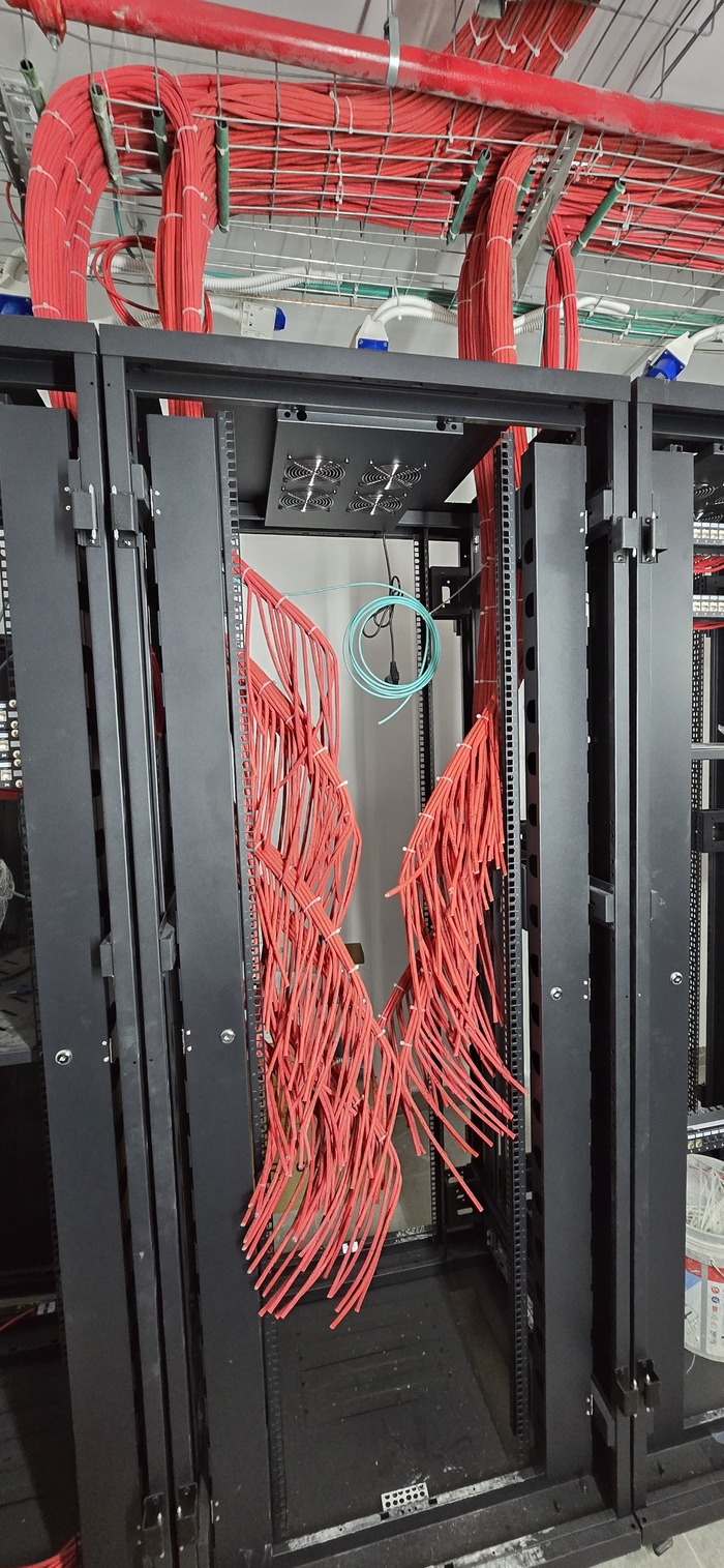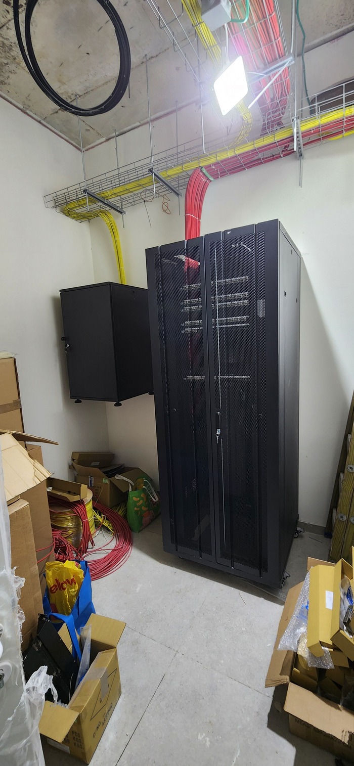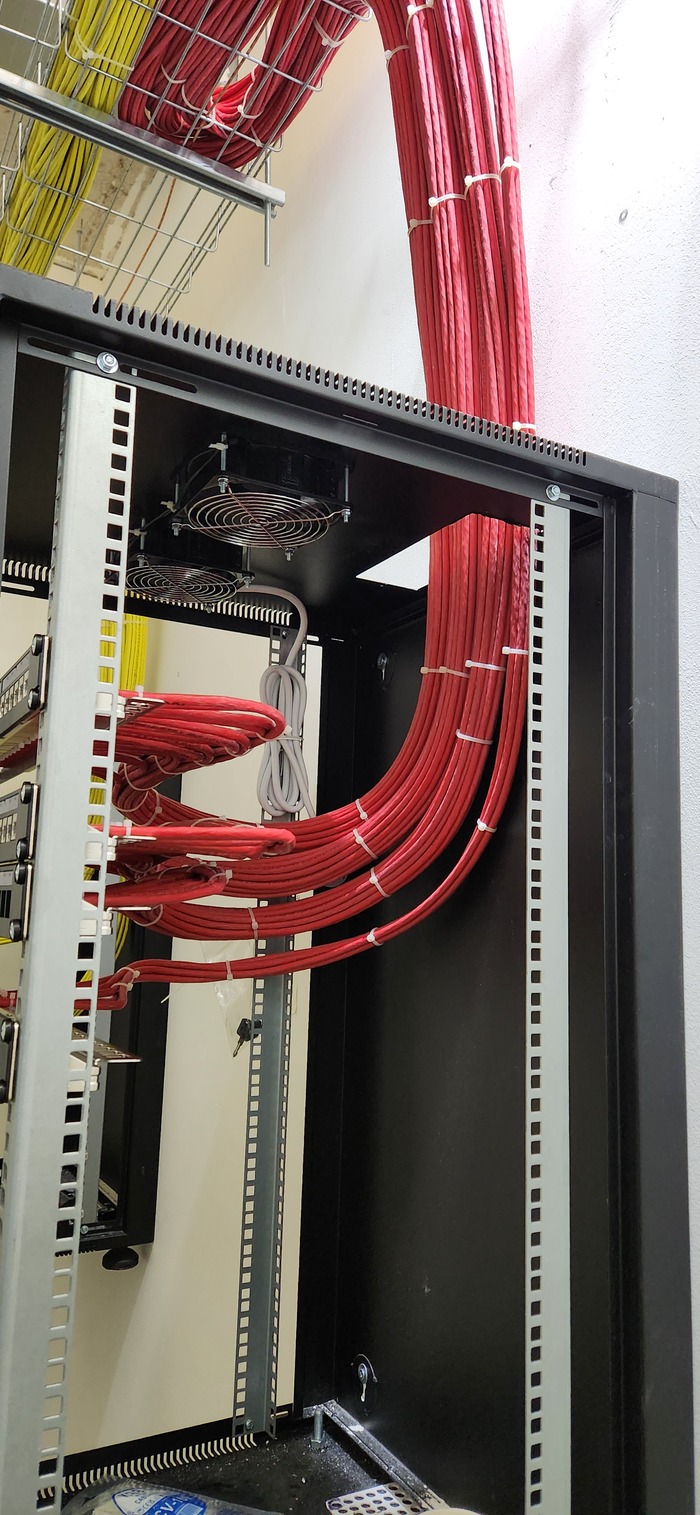 Здание на 7 этажей. Начали с первых четырёх не считая этаж нулевой. На каждом этаже точек по 150 и телефония и обычные точки. На данном этапе протянули 4 этажа. Шкафы закончили только на двух этажах. Жёлтый кабель кат 7а для телефонии. Красный всё остальное.