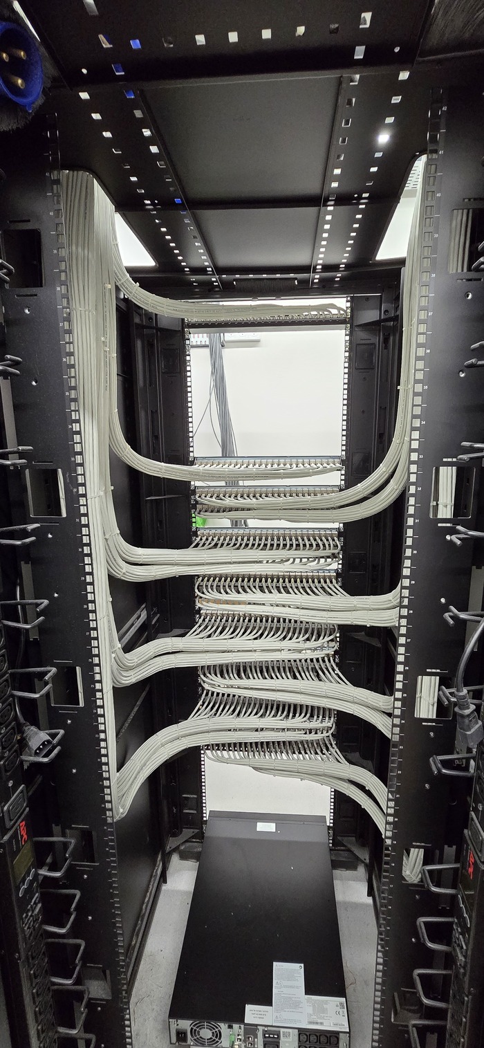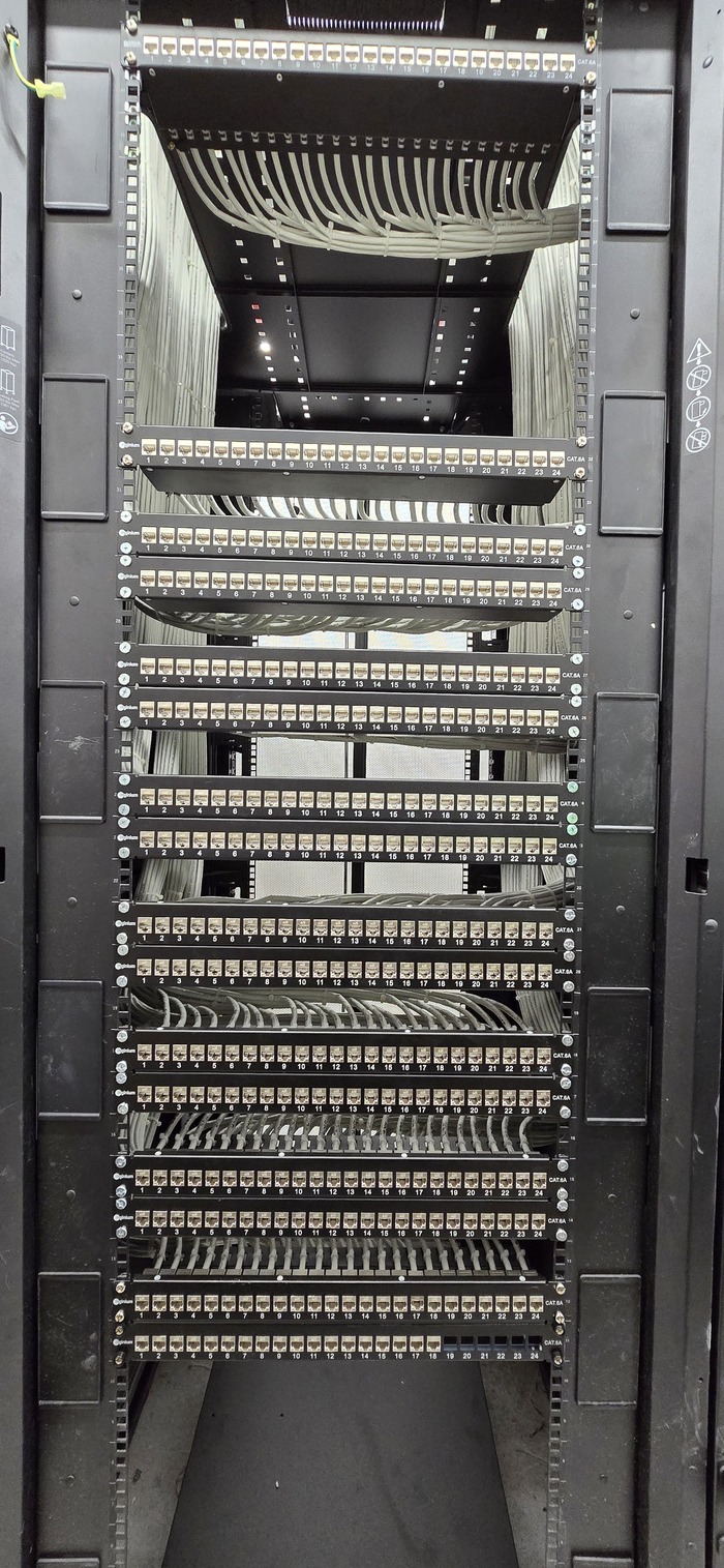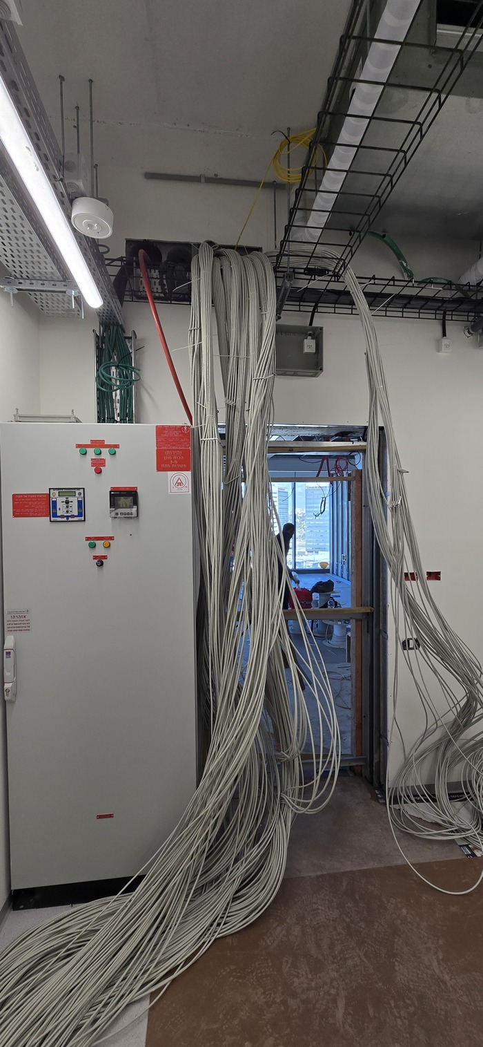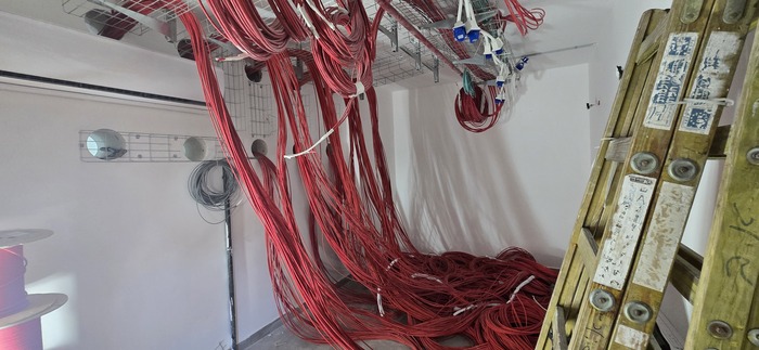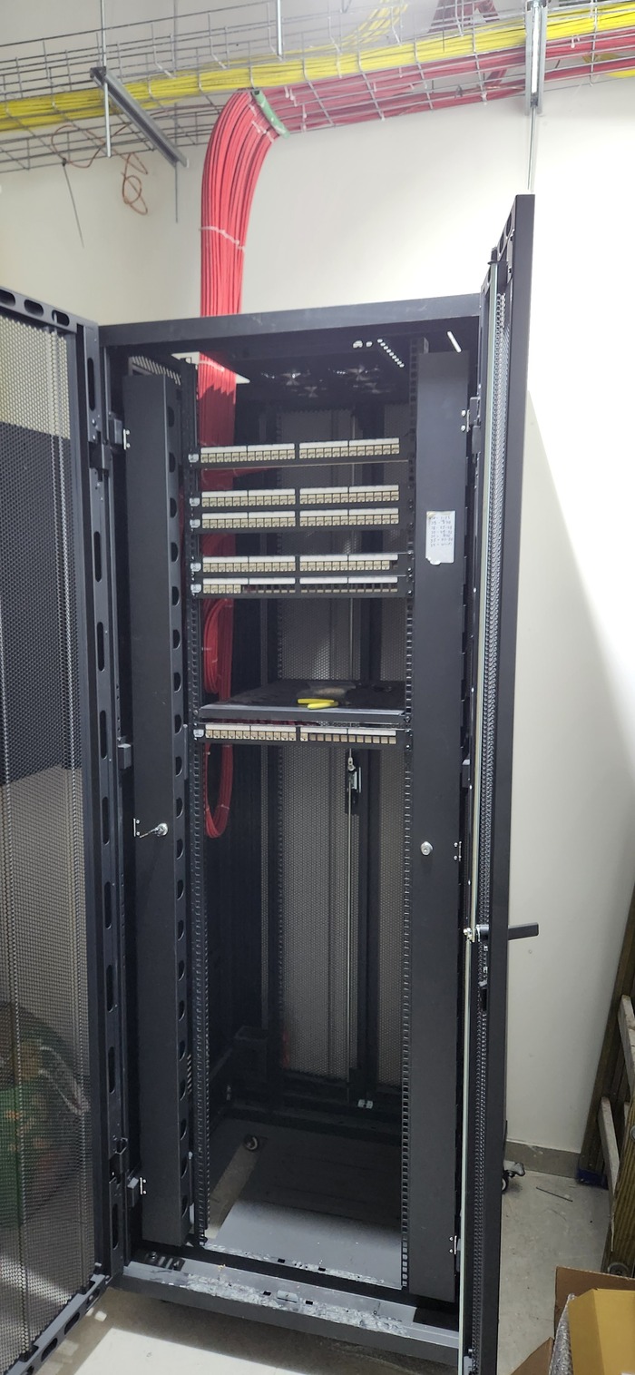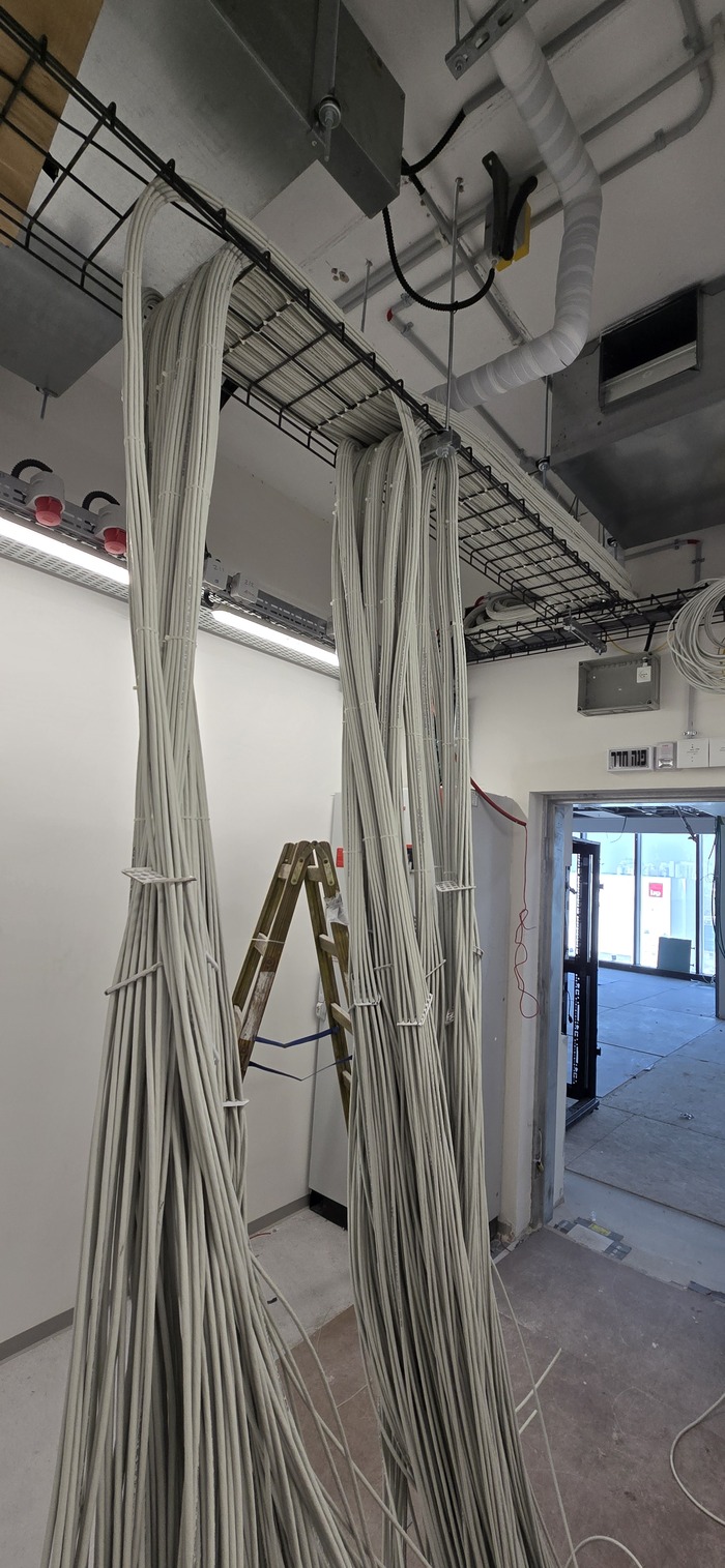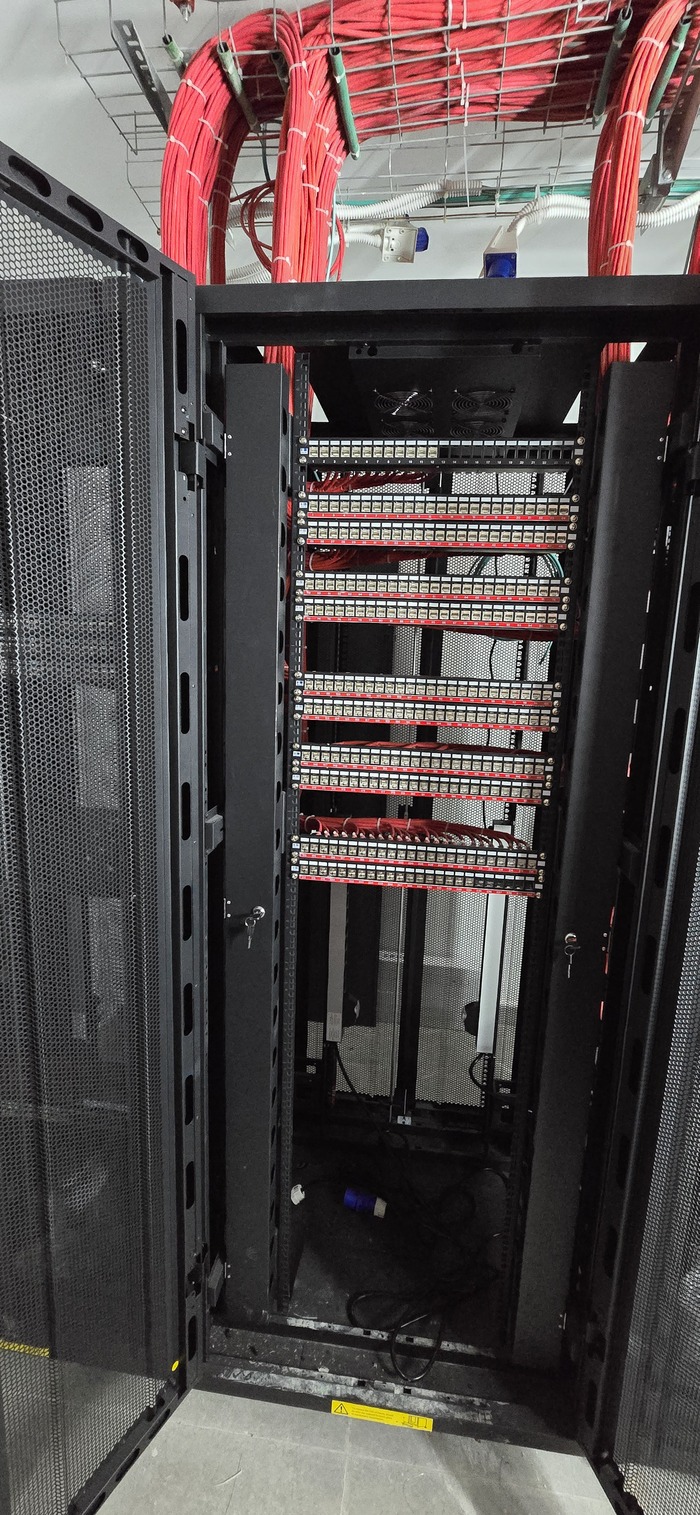 Здание на 7 этажей. Начали с первых четырёх не считая этаж нулевой. На каждом этаже точек по 150 и телефония и обычные точки. На данном этапе протянули 4 этажа. Шкафы закончили только на двух этажах. Жёлтый кабель кат 7а для телефонии. Красный всё остальное.
