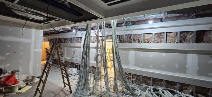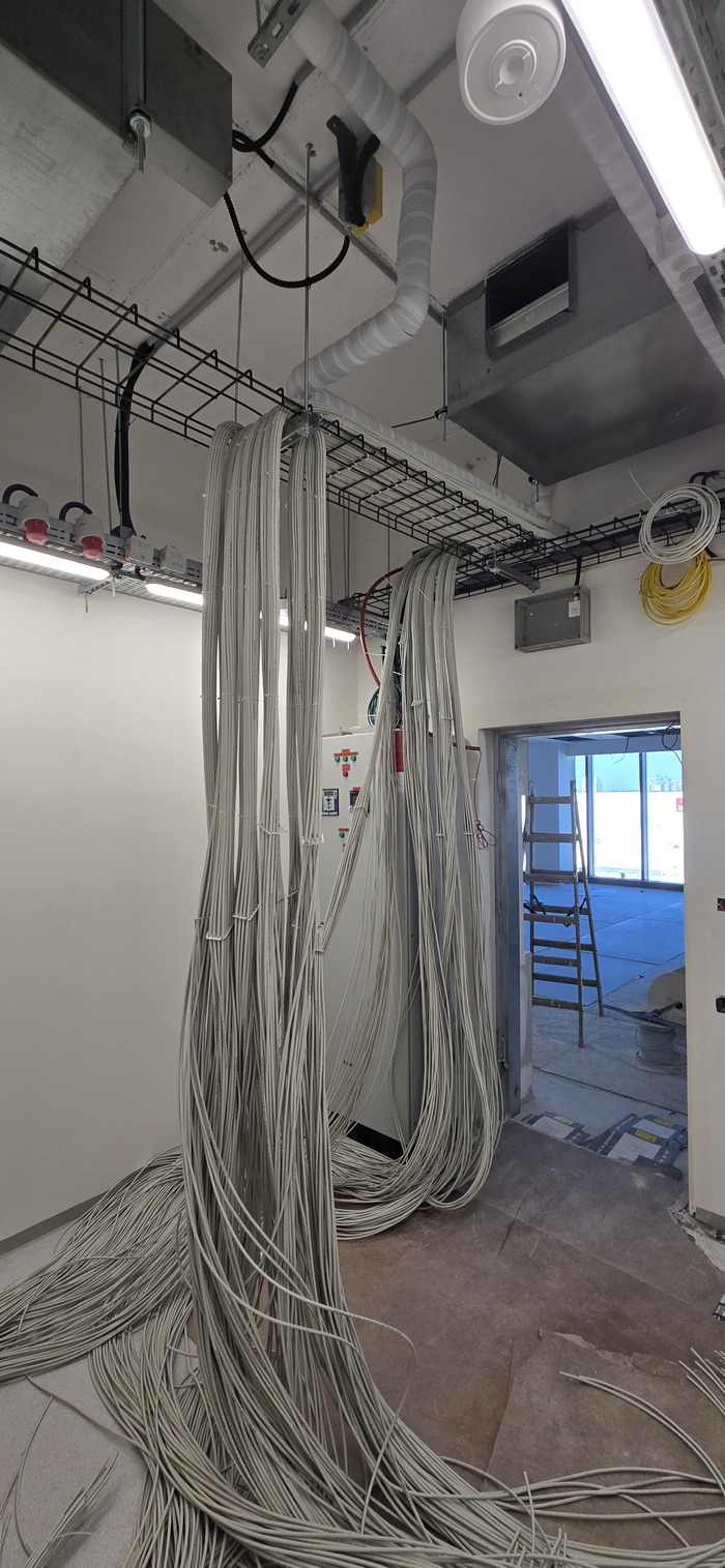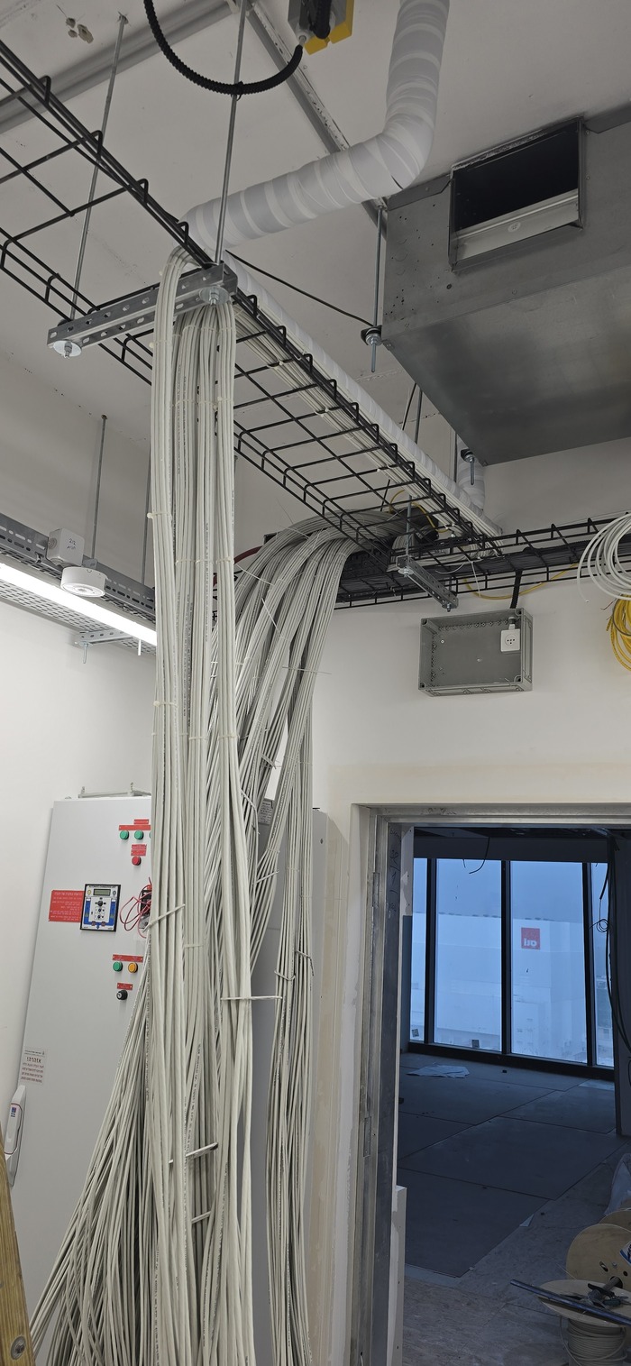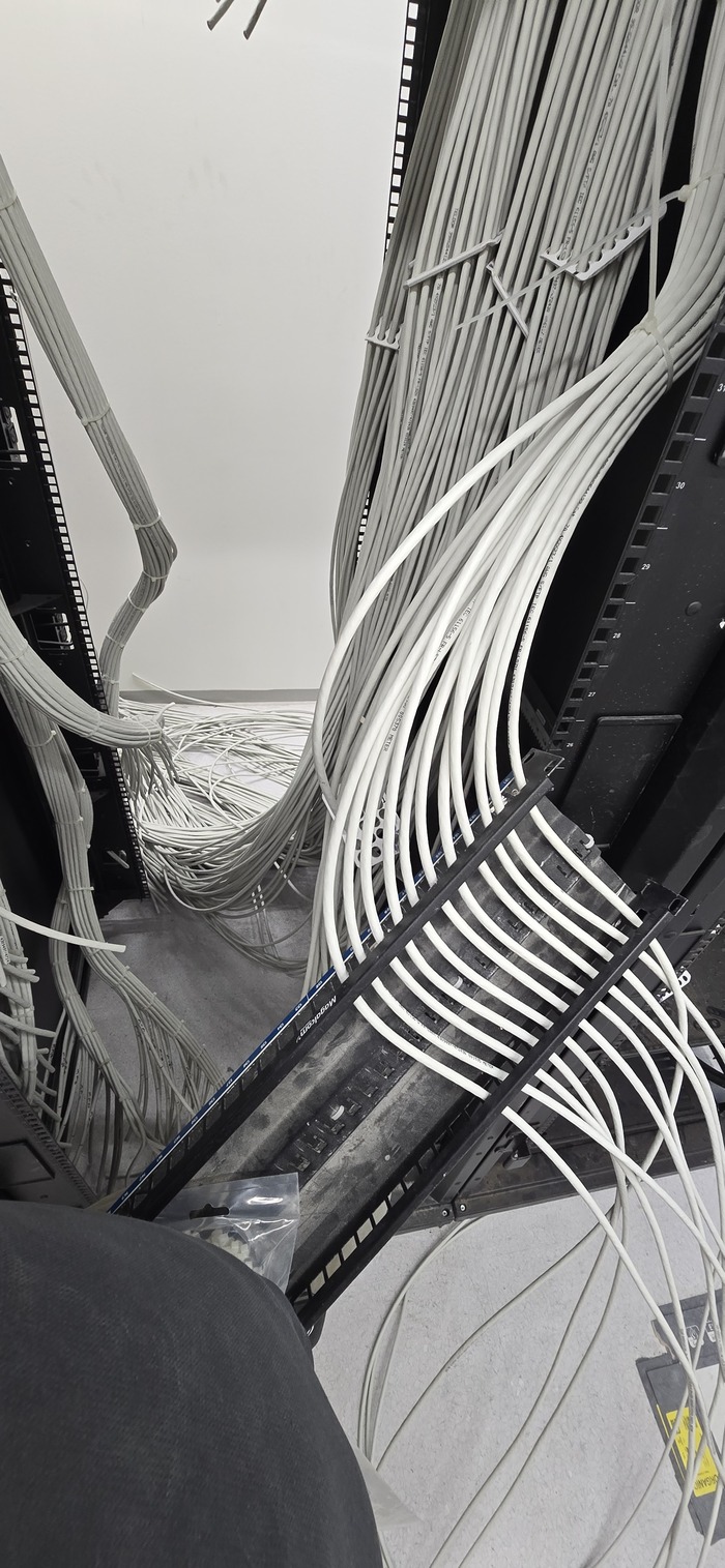 Всем привет. Как часто бывает получил проект после кого-то. Фоток с самого начала не сохранилось. За стенкой этой комнаты было очень много кабеля. И начали мы их заводить по 48 штук в одно отверстие. Которые потом будут заделываться герметично (но не нами).(потом покажу)