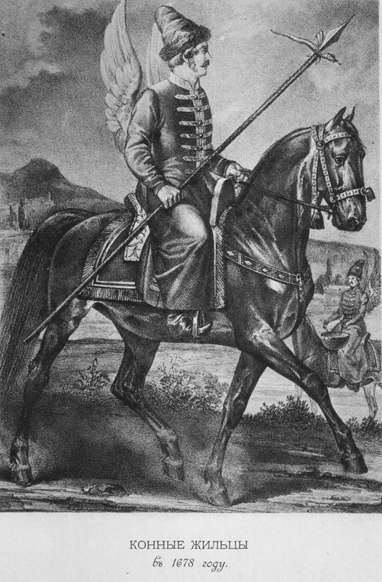 О конных жильцах с крыльями за спиной рассказывает чех Бернгард Таннер, приезжавший в Москву вместе с польско-литовским посольством в 1678 году: "Подъехав к городу ближе, глядим — новый, невиданный дотоле отряд воинов! Цвет длинных красных одеяний был на всех одинаков; сидели они верхом на белых конях, а к плечам у них были прилажены крылья, поднимавшиеся над головой и красиво расписанные; в руках — длинные пики, к концу коих было приделано золотое изображение крылатого дракона, вертевшееся по ветру. Отряд казался ангельским легионом. Кто не подивился бы на такое чудное зрелище, того по справедливости я счел бы слепым и среди цветущего сада, полного всякого рода цветов".
