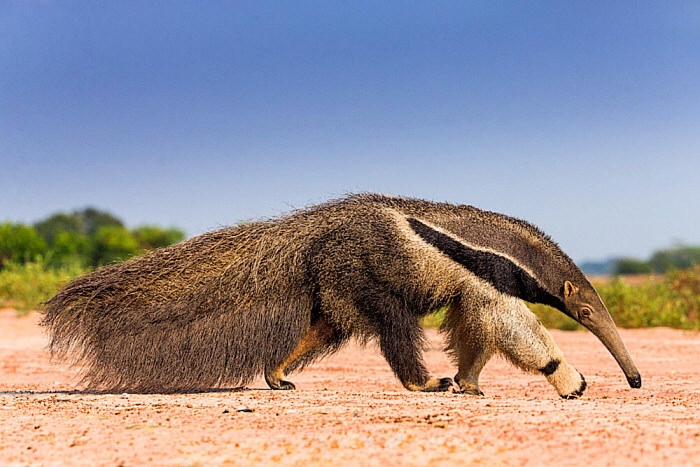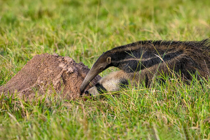 Конечно, вы все узнали гигантского муравьеда (Myrmecophaga tridactyla) – самого крупного представителя отряда неполнозубых. Он, действительно, оправдывает своё название, достигая длины два метра тридцать сантиметров, правда, примерно метр приходится на его роскошный хвост.