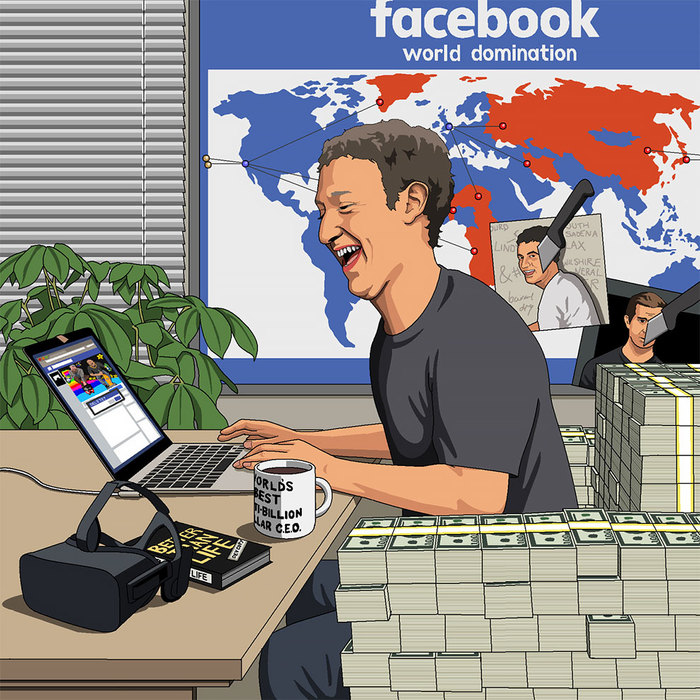 После того как Facebook удалил все гостевые посты со страницы художника за выходные: «Пожалуйста, нарисуйте, как глава Facebook Марк с угрожающим выражением лица удаляет все прекрасные запросы ваших рисунков. Возможно, с демоническим смехом. На заднем плане можно изобразить карту с планом по захвату мира и несколько фотографий его врагов, проткнутых ножами. И стопки купюр. Фантазируйте вволю. Найал Грэм».
