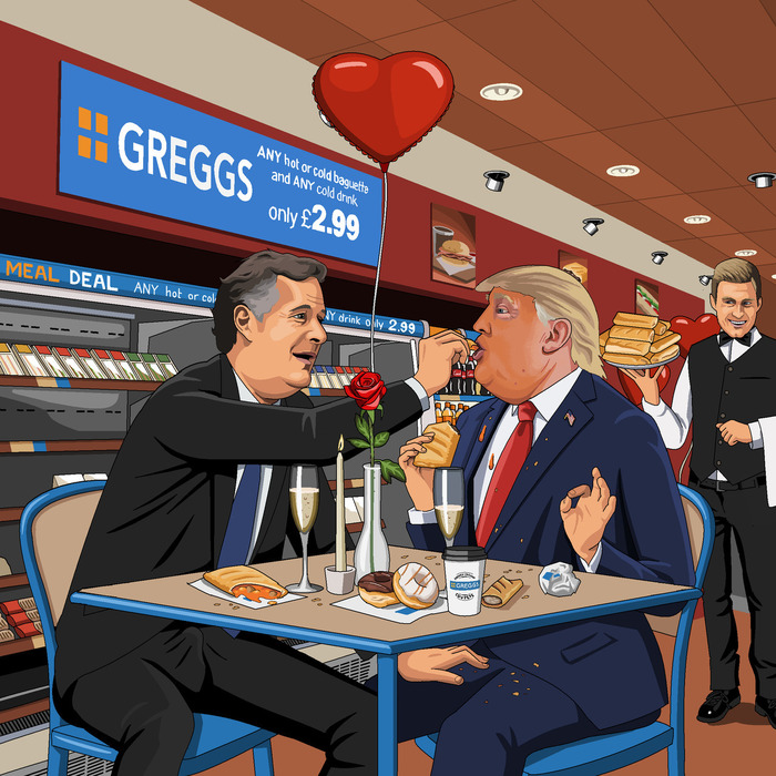 Свидание Дональда Трампа и Пирса Моргана в кафе Greggs в День святого Валентина. По просьбе Эми Би Стинг.