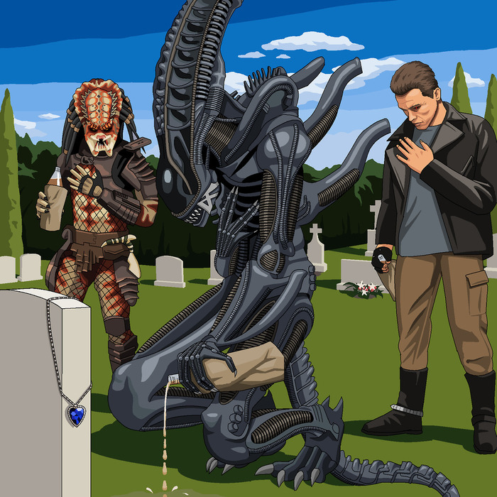 «Чужой, Хищник и Терминатор выливают пиво на могиле Билла Пэкстона. По просьбе Пэттона Освальта, которую прислали мне наши общие подписчики в твиттере».