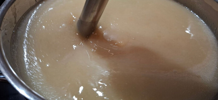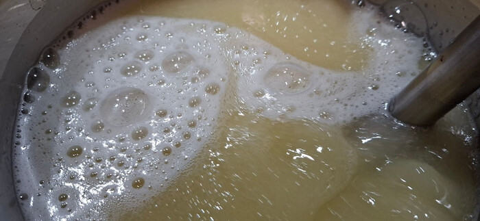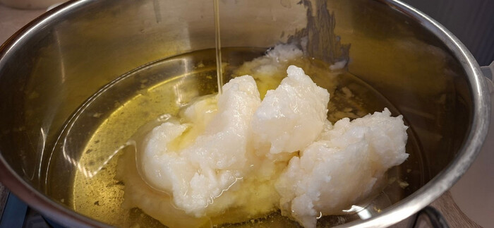 Когда масла расплавились, добавляем щелочной раствор. Начинается реакция омыления — масла превращаются в мыло. Смесь сначала жидкая, почти прозрачная.