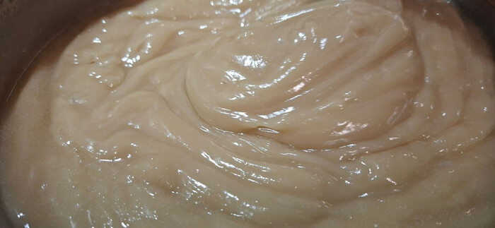 После второго-третьего прогрева масса становится гладкой, эластичной. Это гелевая фаза — мыло почти готово.