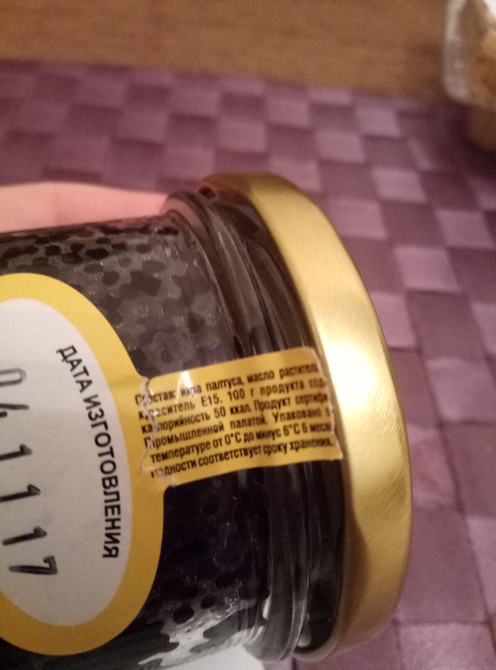Сегодня я решила купить себе немного икры палтуса и купила баночку 150р 100гр, но к сожелению сегодня так и не удалось насладиться знакомым вкусом. Как только я открыла баночку сразу же почувтсвовала знакомый запах, но не тот который ожидала. Это был запах имитированной икры цена которой рублей 30 за 100г. Я надеялась что мои сомнения развеются как только я попробую, ведь в составе же явно указано что икра есть!(срывала не аккуратно, торопилась попробовать, сильно хотелось икру)