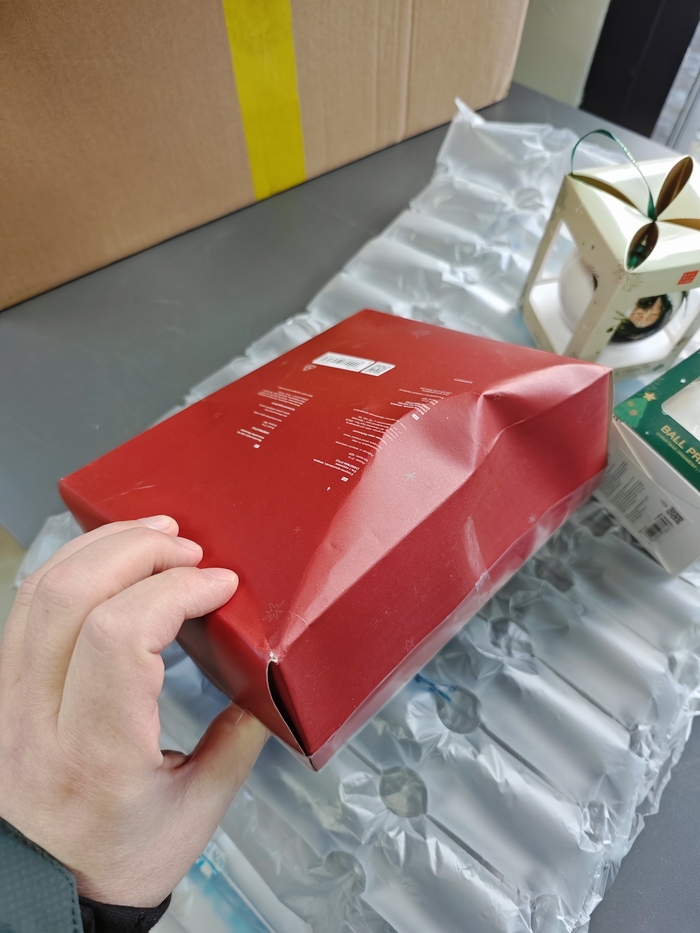 В этот же день, в тот же пункт выдачи приходит вторая посылка (38314716224) с елочными игрушками, с такими же наклейками (хрупкое, верх и т.д)... и она также валяется кверху ногами, в груде других коробок. Слава богу там ничего не разбилось продавцы магазина молодцы, всё очень хорошо упаковали.