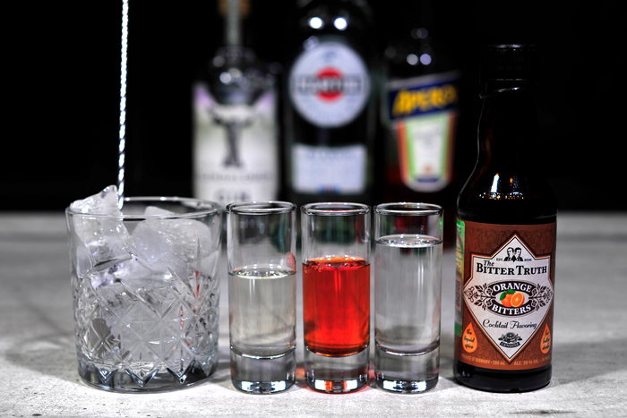 И сливаем в стакан для смешивания. Туда же накапаем пару дэшей апельсинового биттера.