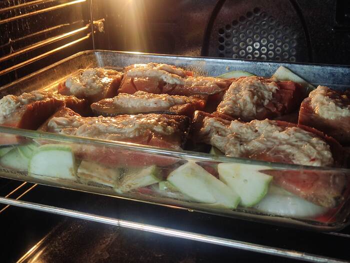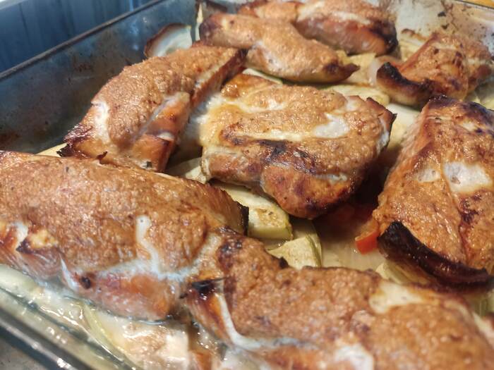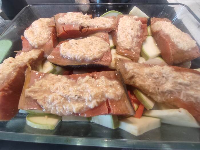 Разогреваем духовку до 180градусов. Овощи солим, перчим, перемешиваем, выкладываем в форму для запекания, рыбку достаём из маринада, выкладываем на овощи, намазываем на неё сырную смесь и отправляем в духовку на 15 минут.