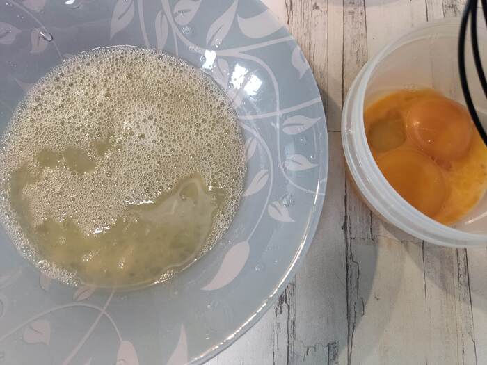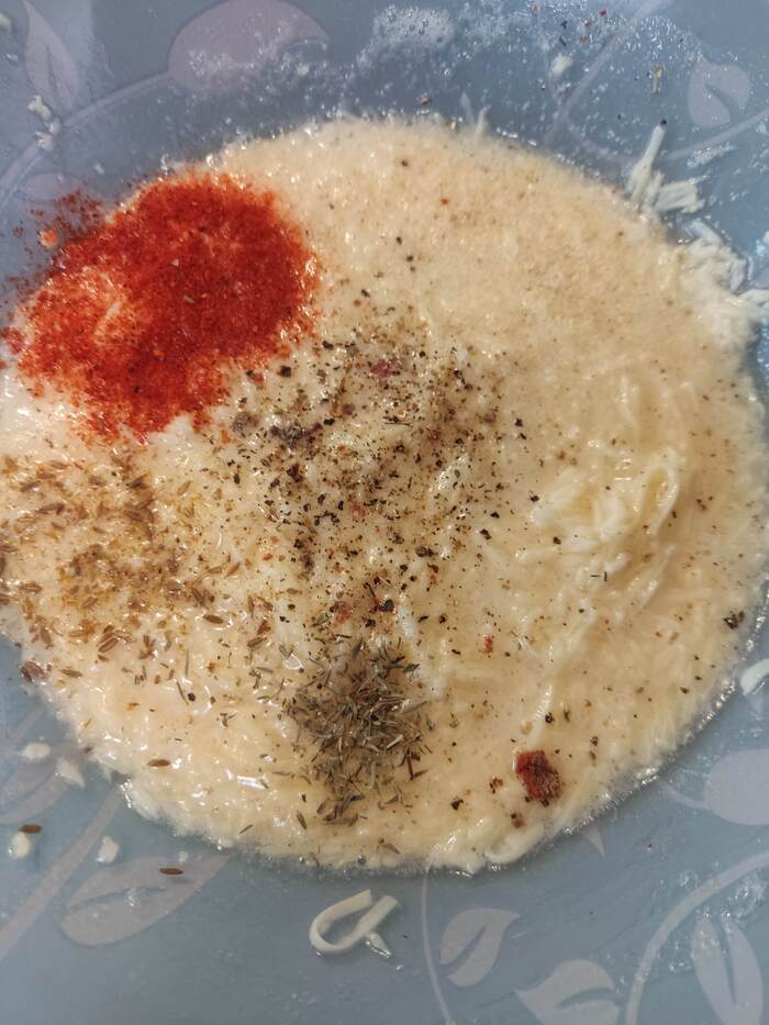Пока маринад действует, готовим сырную смесь: 3 яйца, отделяем белки, белки взбиваем до лёгкой пенки, добавляем 100гр сыра, соль, перец, паприка, чеснок, базилик, перемешиваем.