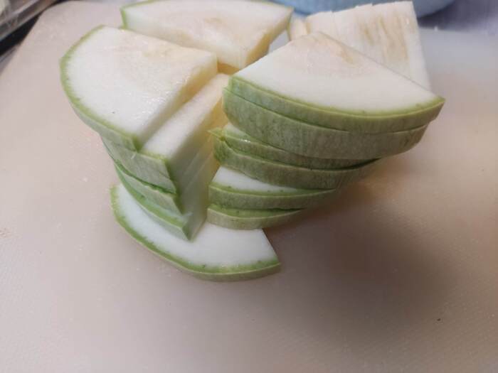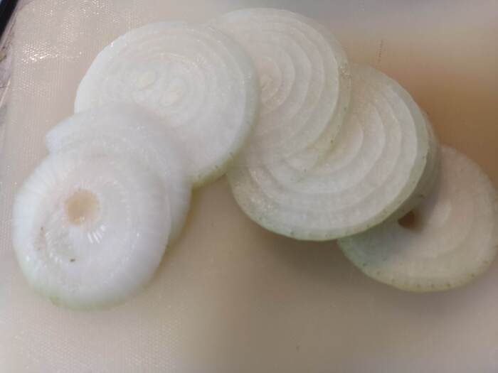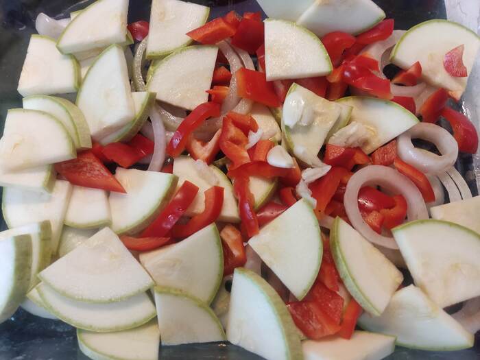 Берём овощи, те, которые есть. Репчатый лук 1шт. режем кольцами, кабачок ( 1 небольшой или 1/2 большого, у меня вышло 400гр) режем шайбами толщиной 0.5см + на 4 части. Красный болгарский перец 1 шт режем небольшим кубиком ( каким же сразу ярким, красивым становится блюдо с красным перцем!).