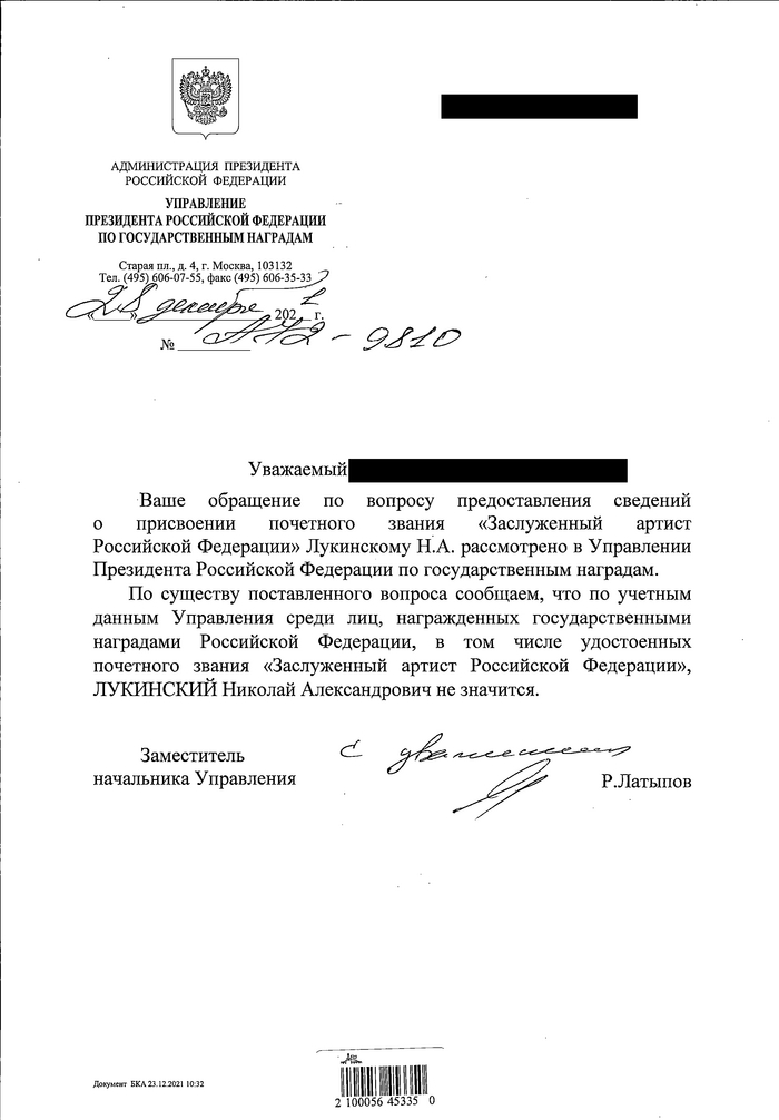 Может быть артист награжден секретным указом, так сказать за секретную юмористическую спецоперацию. Рассмешил, так сказать, врагов государства до смерти. Ну что же, проверим и это. Направим запрос в Управление Президента по государственным наградам - там-то точно знают когда, где, кого и за что награждали. И... внезапно (нет) ответ: