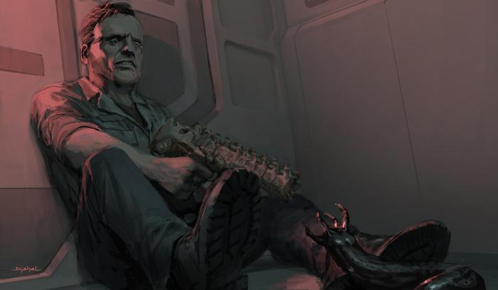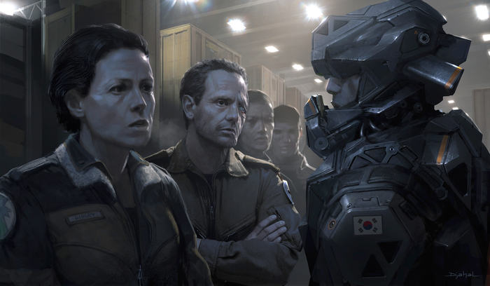 Что еще особенно интересно - есть арт с Рипли в биомеханическом костюме и частичной надписью “Пилот М<...> - Космический Жокей”. Очевидно, корпорация зашла настолько далеко в изучении наследия Инженеров, что смогла воссоздать некоторые из их технологий.