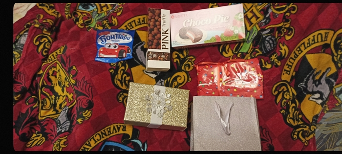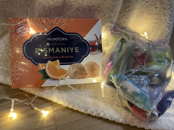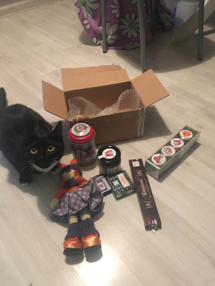 Меня ожидали вкусняшки, очаровательная коробочка, симпатичный сверток, и подарочный пакетик:)