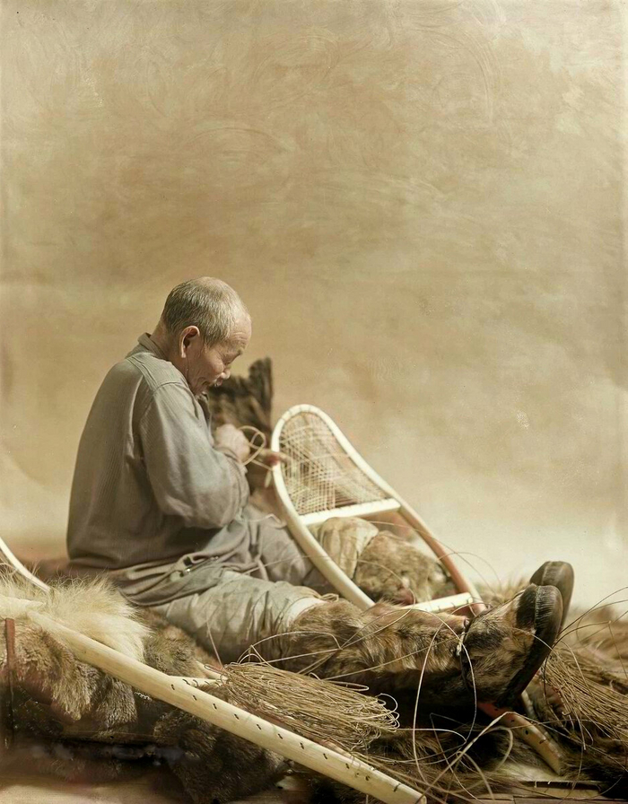 Мужчина-эскимос, делающий снегоступы.