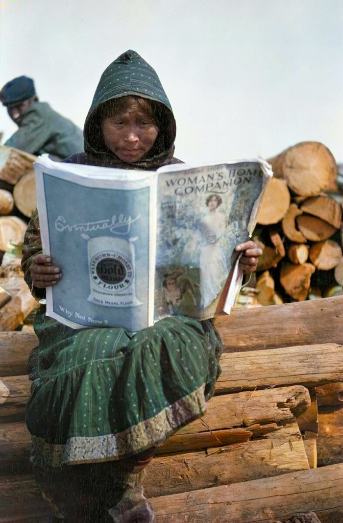 Эскимосская женщина читает журнал "Домашний компаньон женщины".