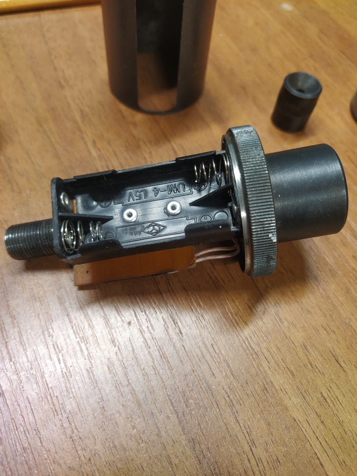 Ну так вот, разбираясь в хламе на одном объекте нашлось вот это. Что мы имеем, разборную конструкцию, батарейный блок, плату с подстроечником. Батарейки ставил, не работает. Опрос и беглый поиск ничего не дали, но вроде как на дне трубки угадывается что-то типа линзы лазера или фотоэлемент, да и форма наконечника похожа на окуляр для юстировки, но оптических элементов в нем никаких. Может быть мы на пороге величайших открытий как в фильме НОМа. Что это?