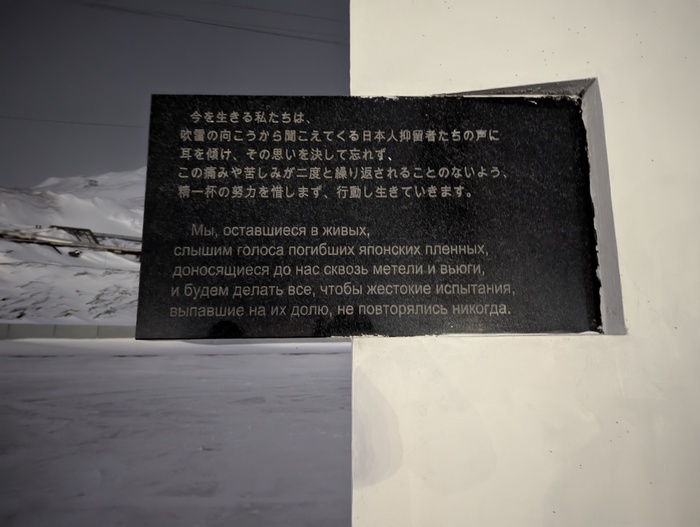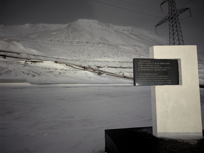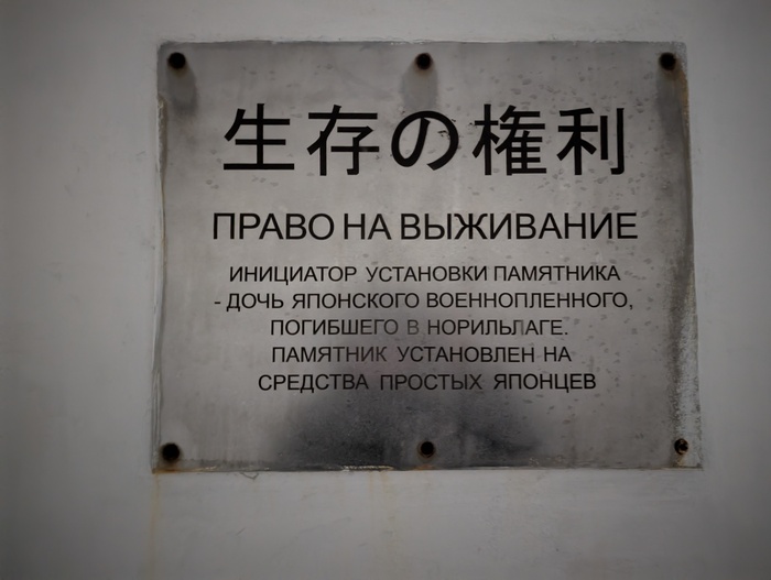 Памятная табличка всем японцам, прошедшим Норильлаг установлена на так называемой “Норильской Голгофе”, построенной на месте массовых захоронений репрессированных.