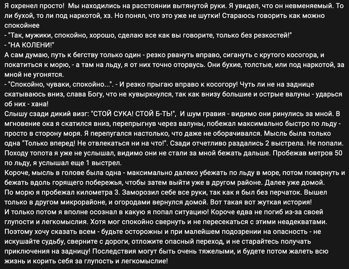 Слышу сзади дикий визг: "СТОЙ СУКА! СТОЙ Б-ТЬ!", И шум гравия - видимо они ринулись за мной. В мгновение ока я скатился вниз, перепрыгнув через валуны, побежал максимально быстро по льду - просто в сторону моря. Я перепугался настолько, что даже не оборачивался. Мысль была только одна "Только вперед! Не отвлекаться ни на что!". Сзади отчетливо раздались 2 выстрела. Не попали. Походу топота я уже не услышал, видимо они не стали за мной бежать дальше. Пробежав метров 50 по льду, я услышал еще 1 выстрел.