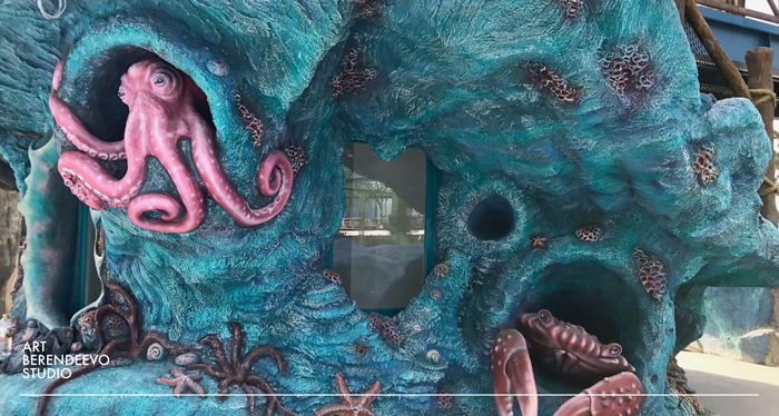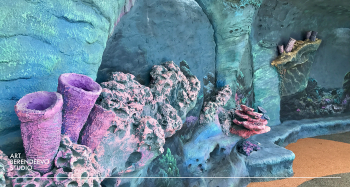 Тенденция использования арт бетона для декорирования аквапарков и океанариумов стремительно набирает популярность по всему миру, благодаря множеству выгодных свойств материала и эффектности готового декора. Мастера ART BERENDEEVO STUDIO с легкостью воплотят в жизнь любые приглянувшиеся вам декорации.