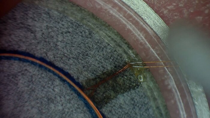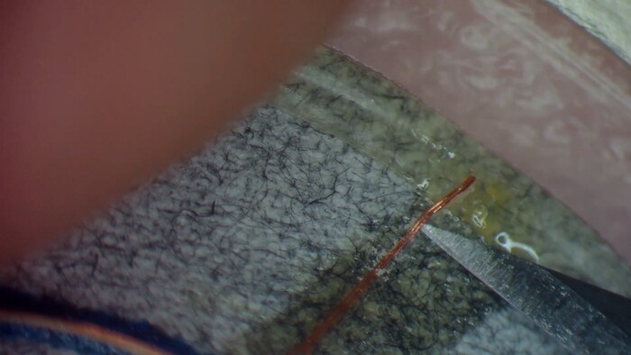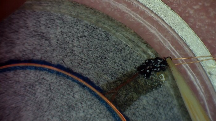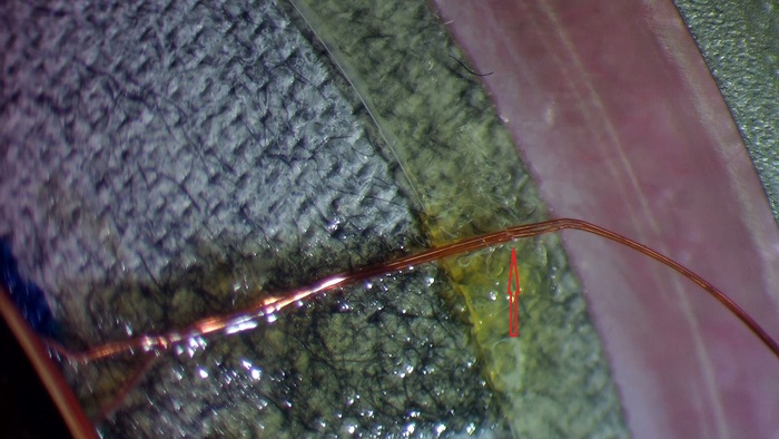 Провод очень тонкий и хрупкий. Его нельзя повредить не в коем случае. А то придется еще дальше зачищать. Одно не ловкое движение скальпелем и можно повредить провод или мембрану.