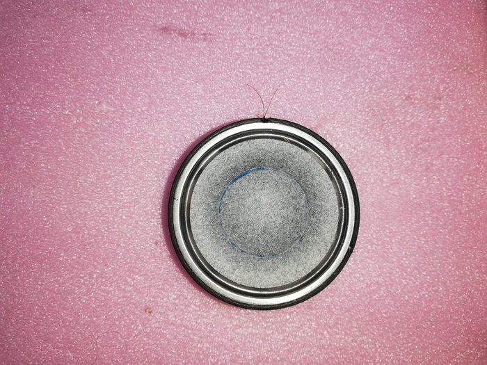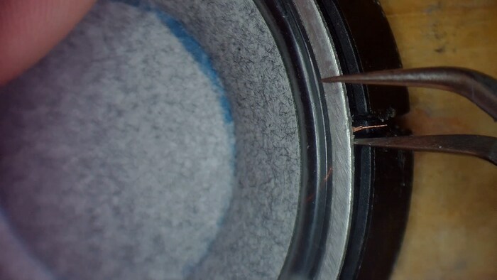 Запихиваем пинцет между мембраной и корпусом динамика и очень нежно ведем пинцет по кругу.