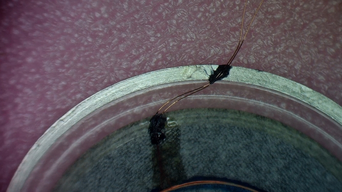 Обмотка с мембраны динамика выходит наружу через отверстие в корпусе. Далее припаивается к контактам с обратной стороны корпуса динамика. Как правило, обрыв происходит в районе выхода проводников из под мембраны. Так как там максимальная амплитуда колебания мембраны. И не каждый провод выдерживает. Тут роль играет огромное множество конструктивных нюансов.