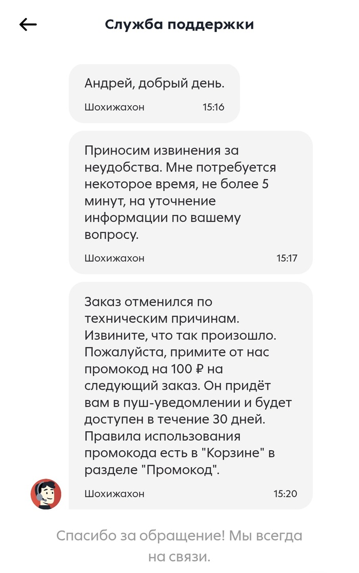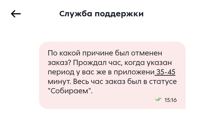 Прождав целый час, томно наблюдая всё это время на статус заказа "Собираем", заказ отменился без каких-либо объяснений причин. Я связался с онлайн-поддержкой и вот моё первое обращение: