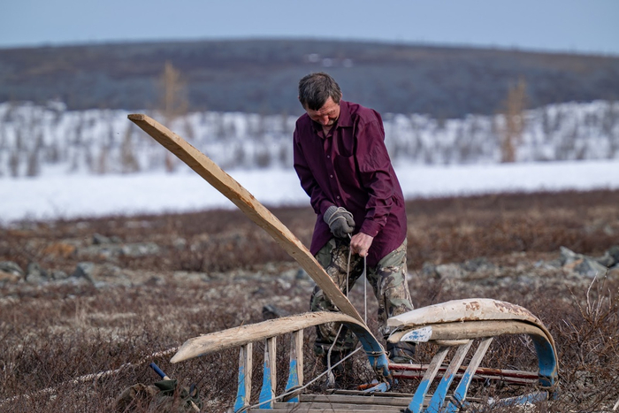 Мужчины тоже не сидят просто так. Один оленевод стоит около нарты и шлифует доски.